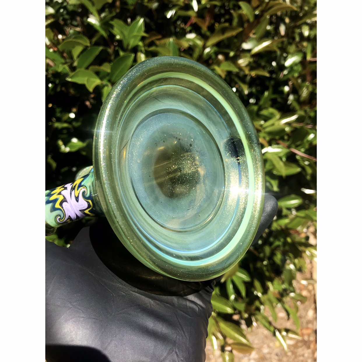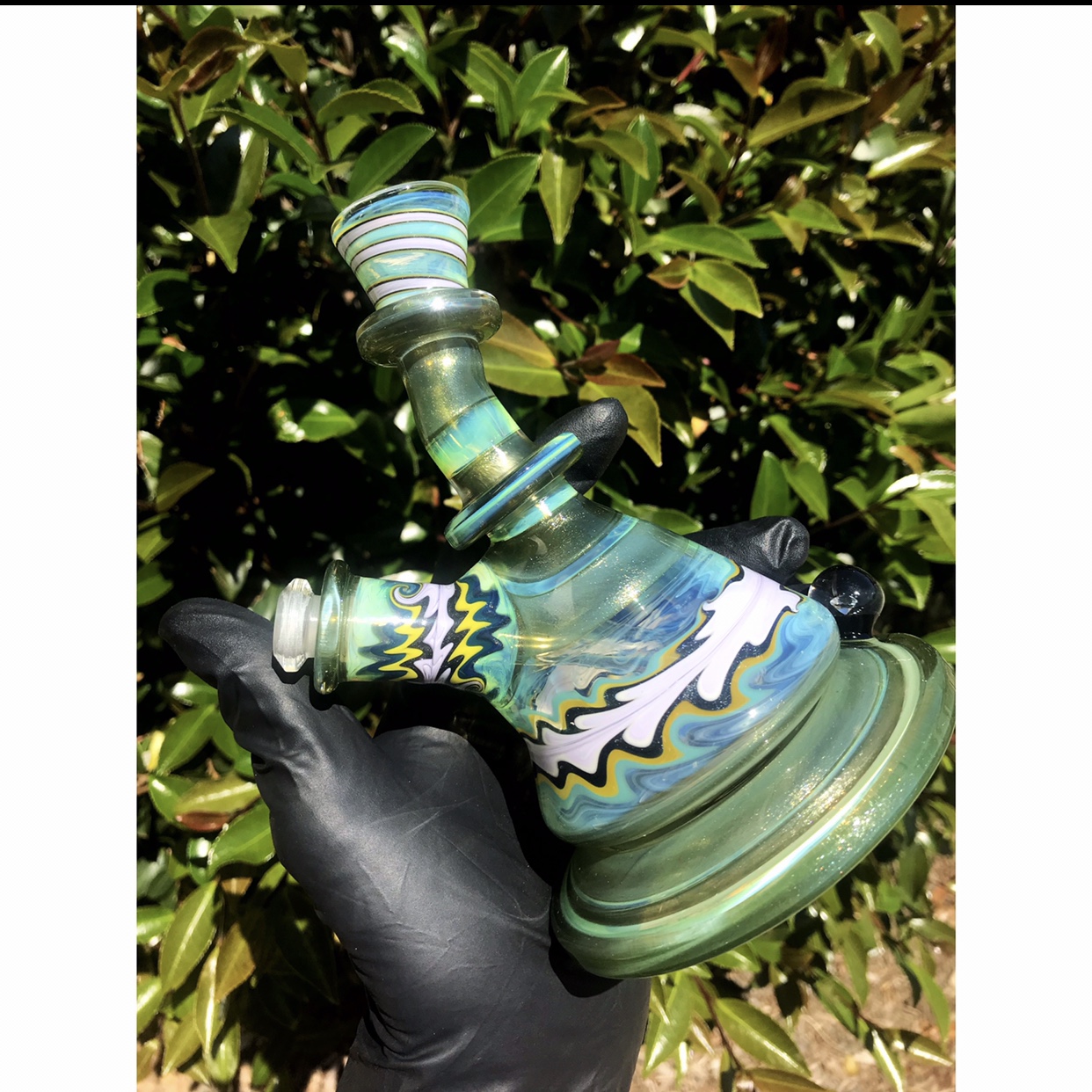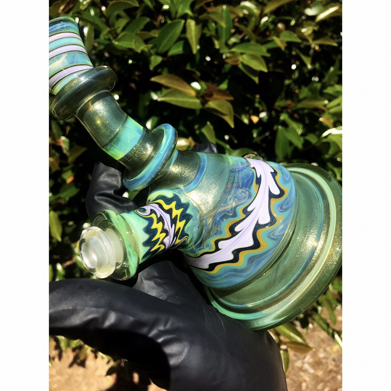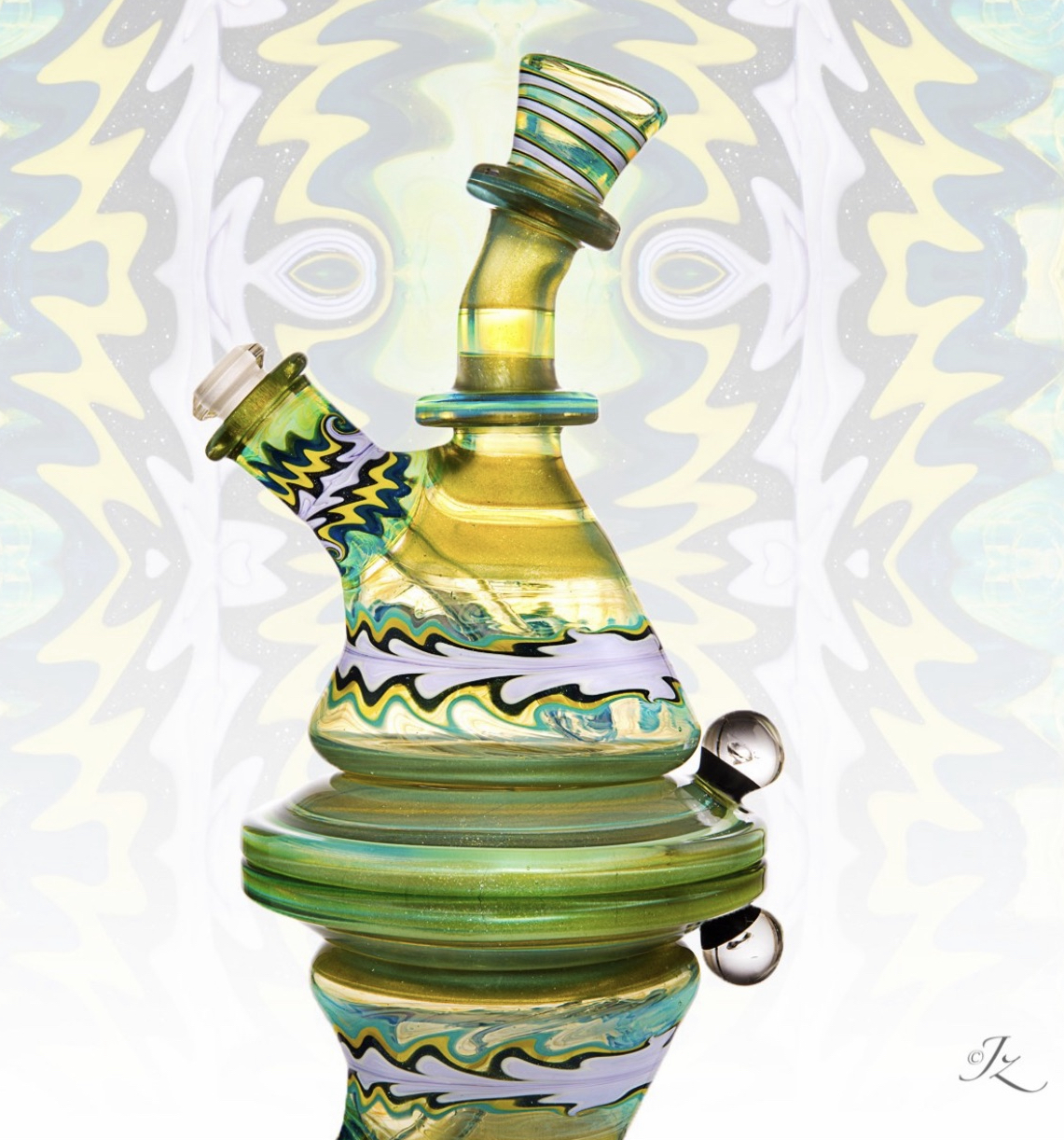 This mini beaker from 710SciGlass features wigwag sections, an encased synthetic diamond, and beautiful shaping to bring it all together!