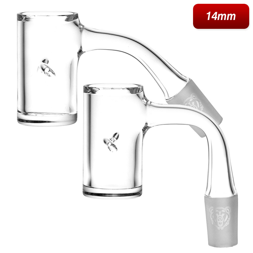 This Bear Quartz Auto Pro Banger has a 14mm male joint size available with a 45 degree or 90 degree joint angle. These quality made bangers have a wide bucket with a beveled edge and feature auto spinner vortex holes that create a spiral air pattern within the banger.