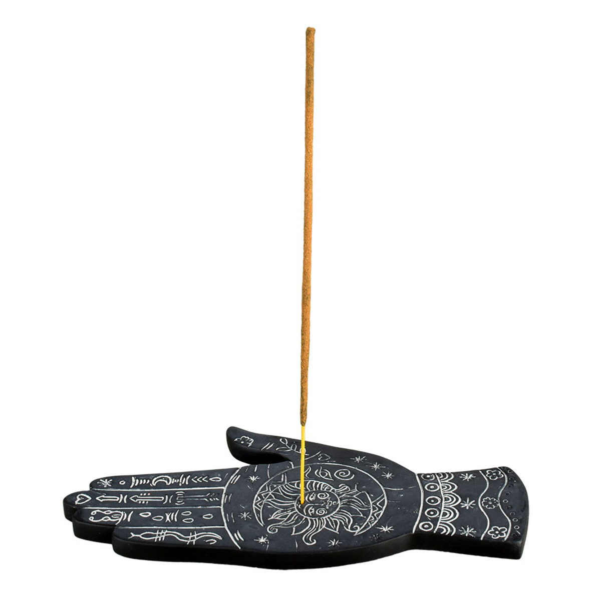 Meditate on the mysteries of life that are riddled in the palm with this Black Palmistry Incense Burner. Carved with astrological symbols and designs, this polyresin incense burner measures 3.4 inches by 7.5 inches (8.6cm x 19.1cm) and can hold either incense sticks or cones.