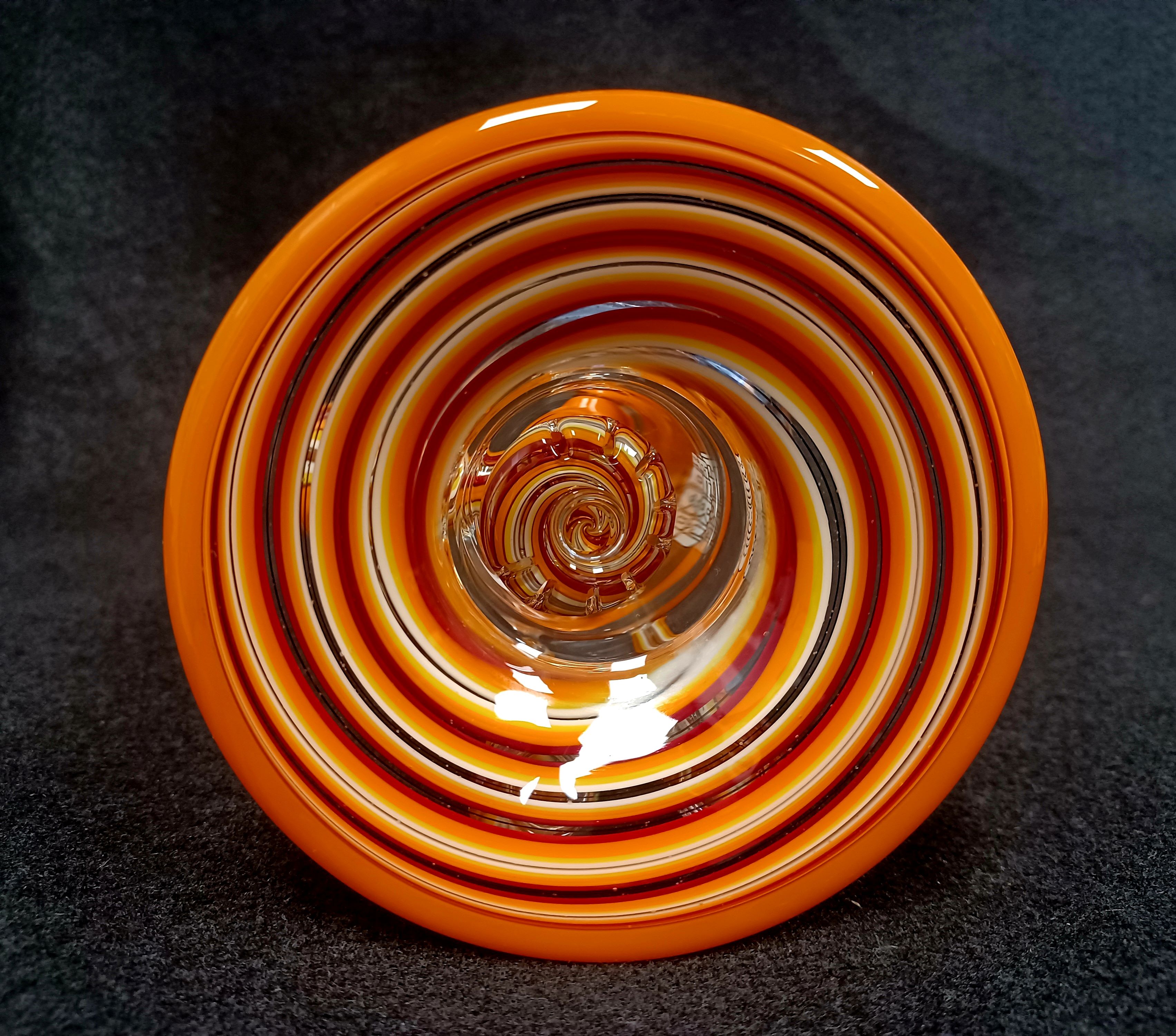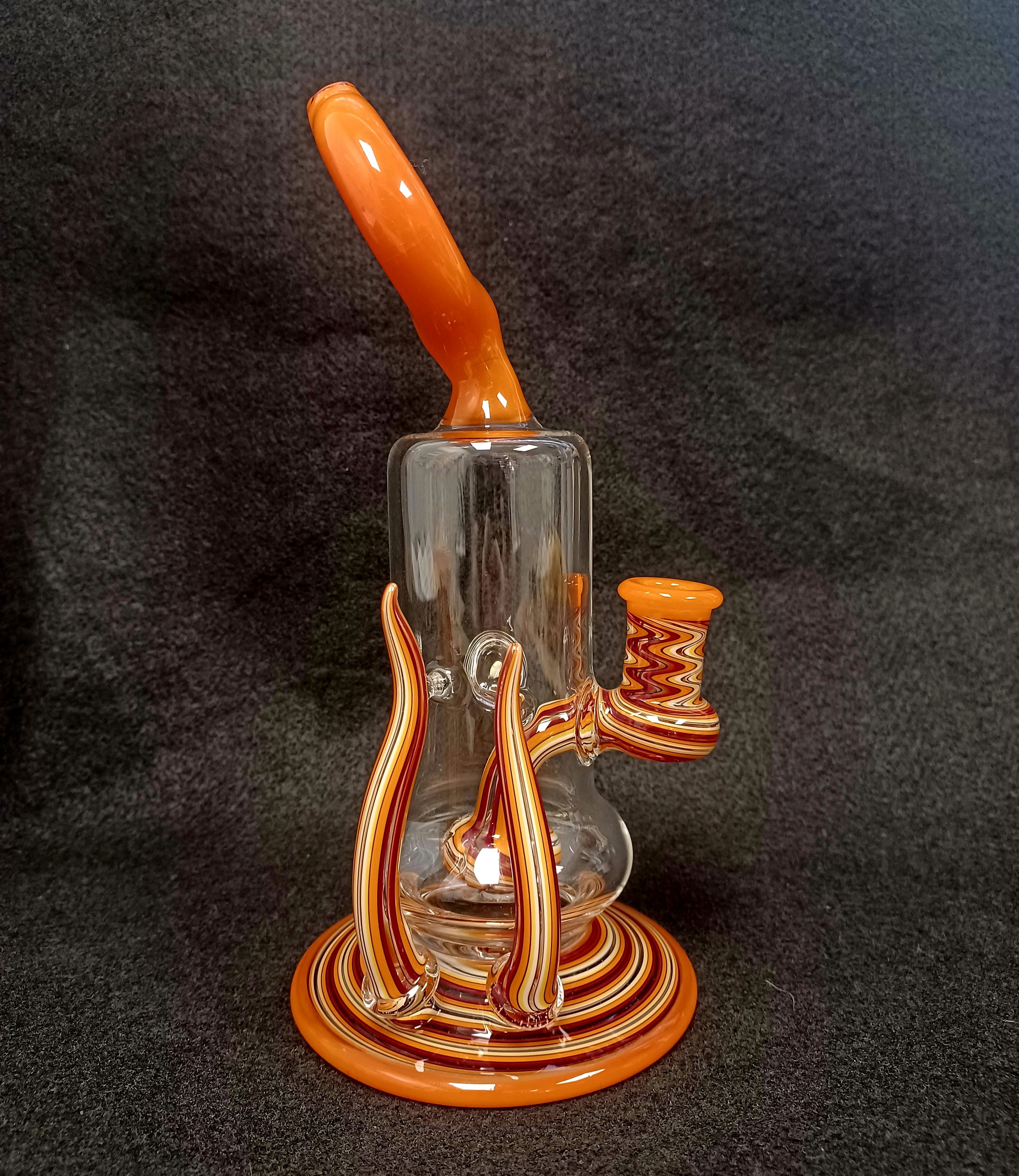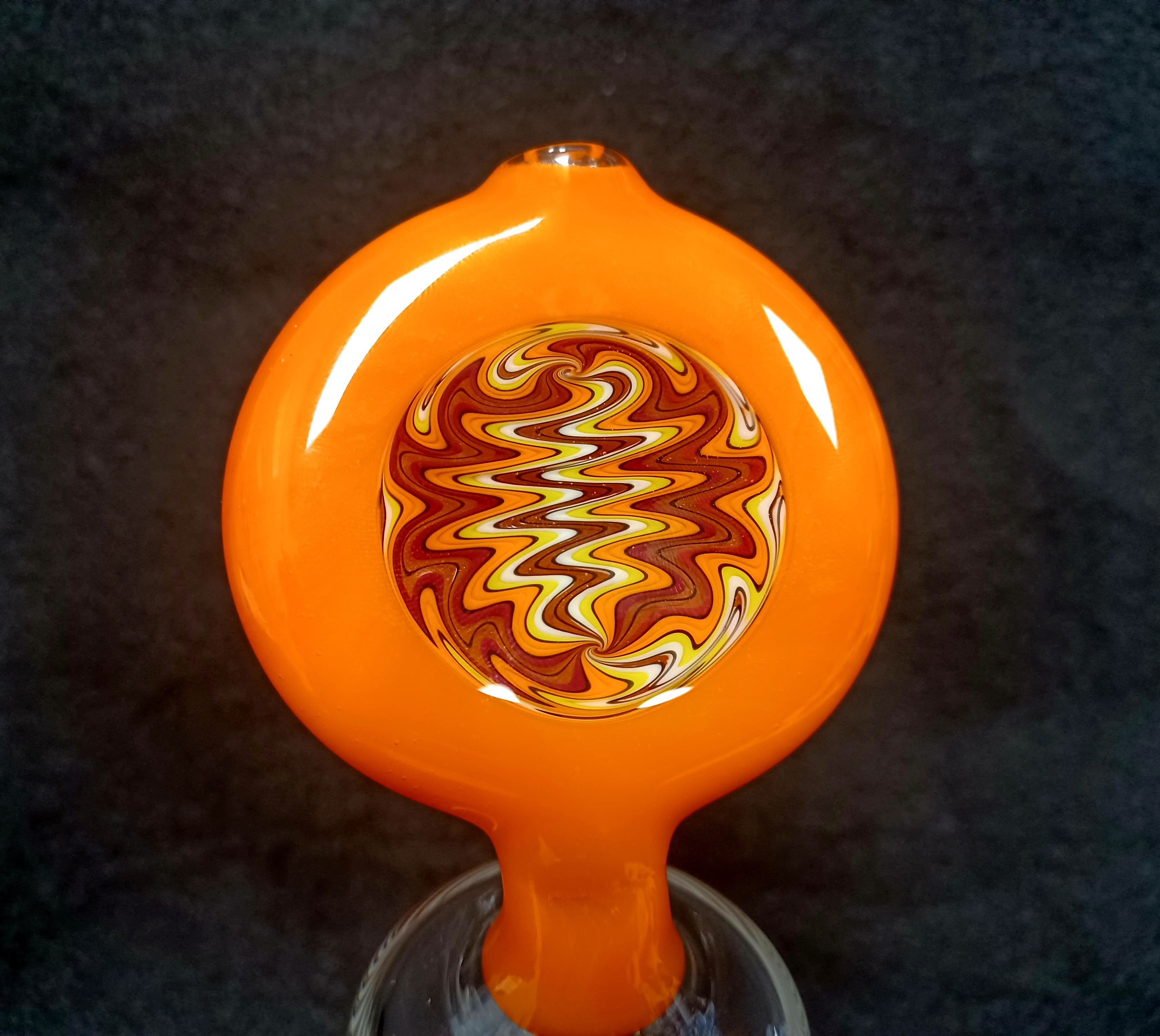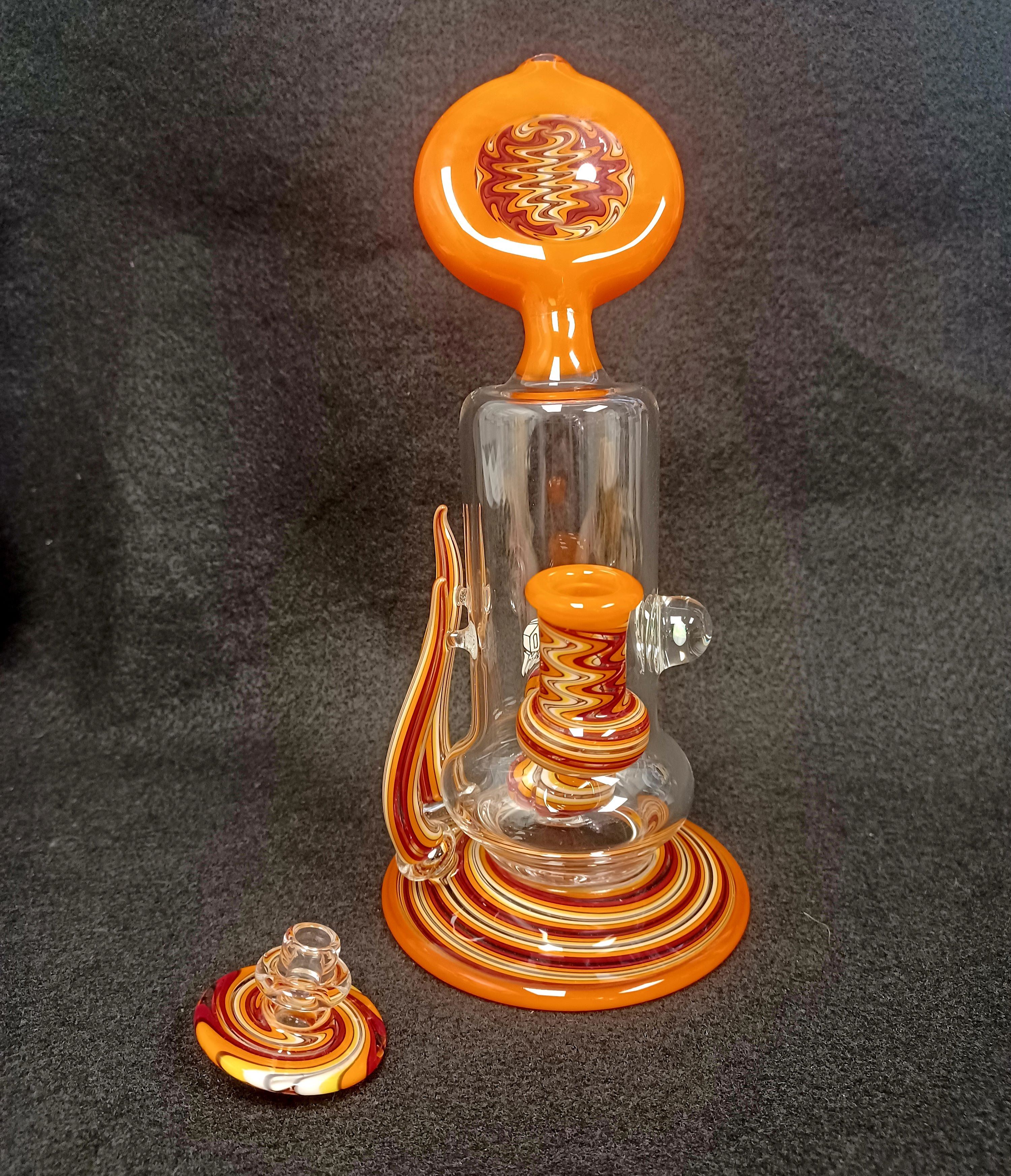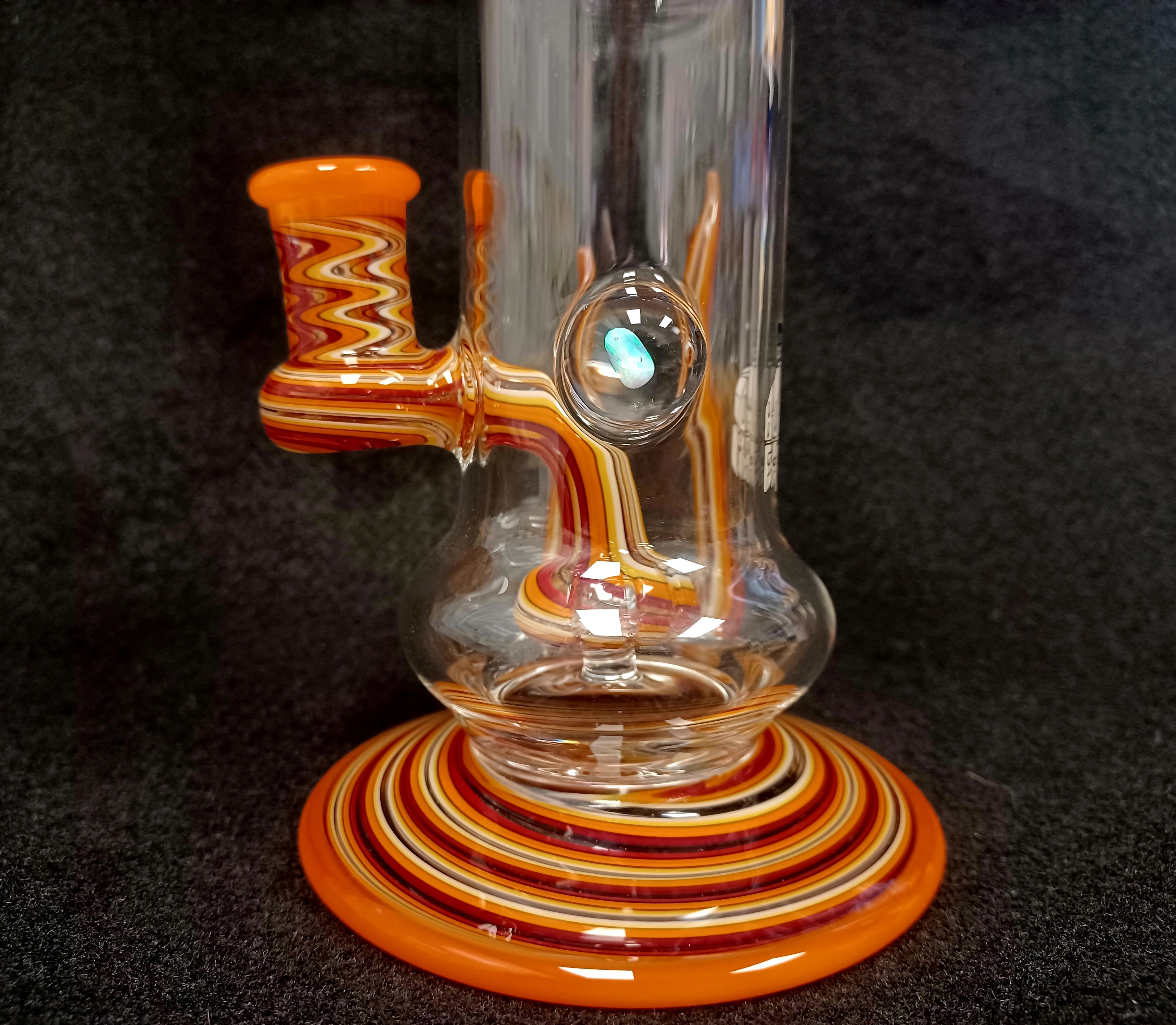 This orange wig wag rig, from Borofarm, is fire! Gorgeous work from top to bottom! Check out the accent spikes and encased opal. The function on this piece is insane with the disc perc! This rig is 14mm and comes with a matching carb cap.