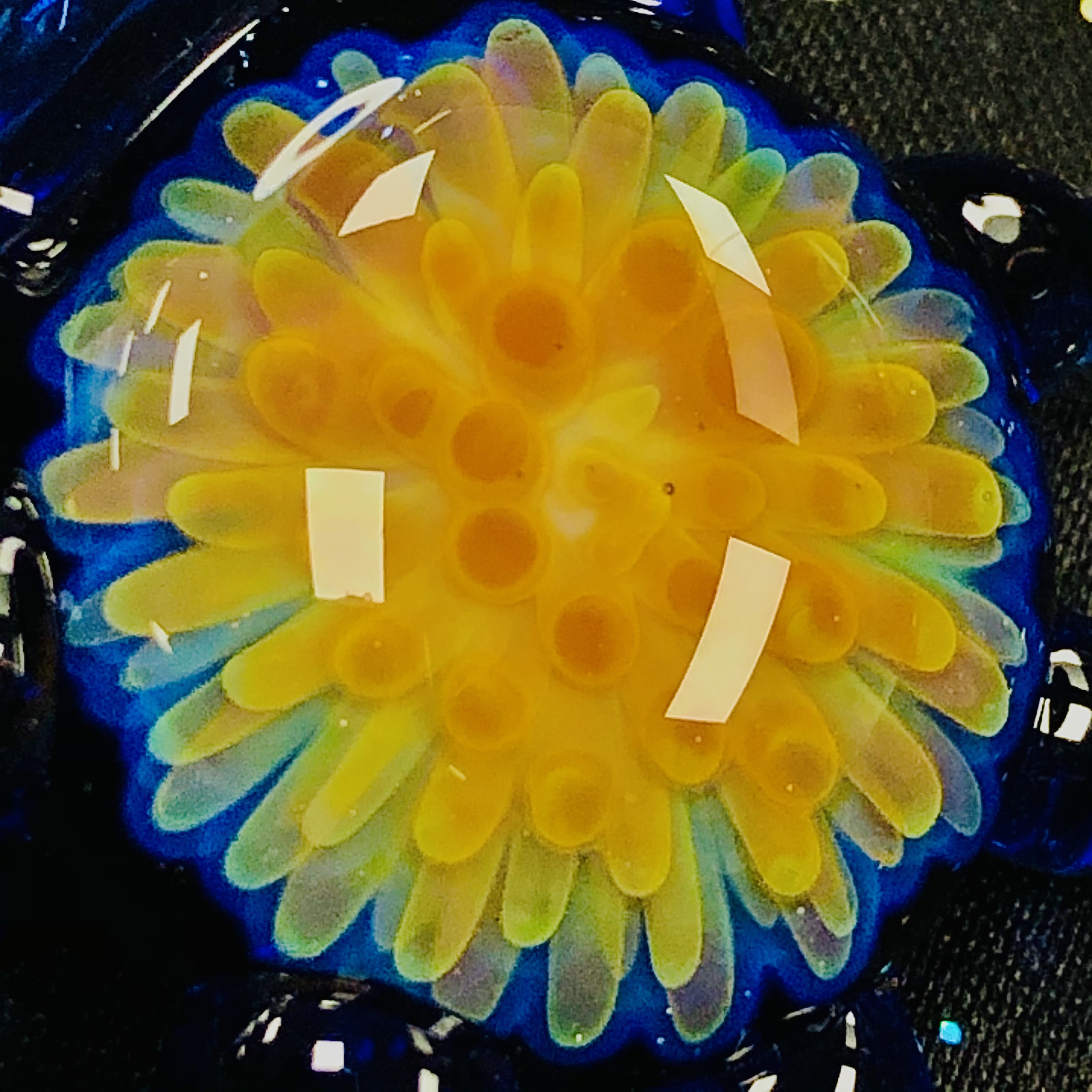 And in center a blossoming orange flower implosion, made of Silver Bullet, both colours by Northstar Glass