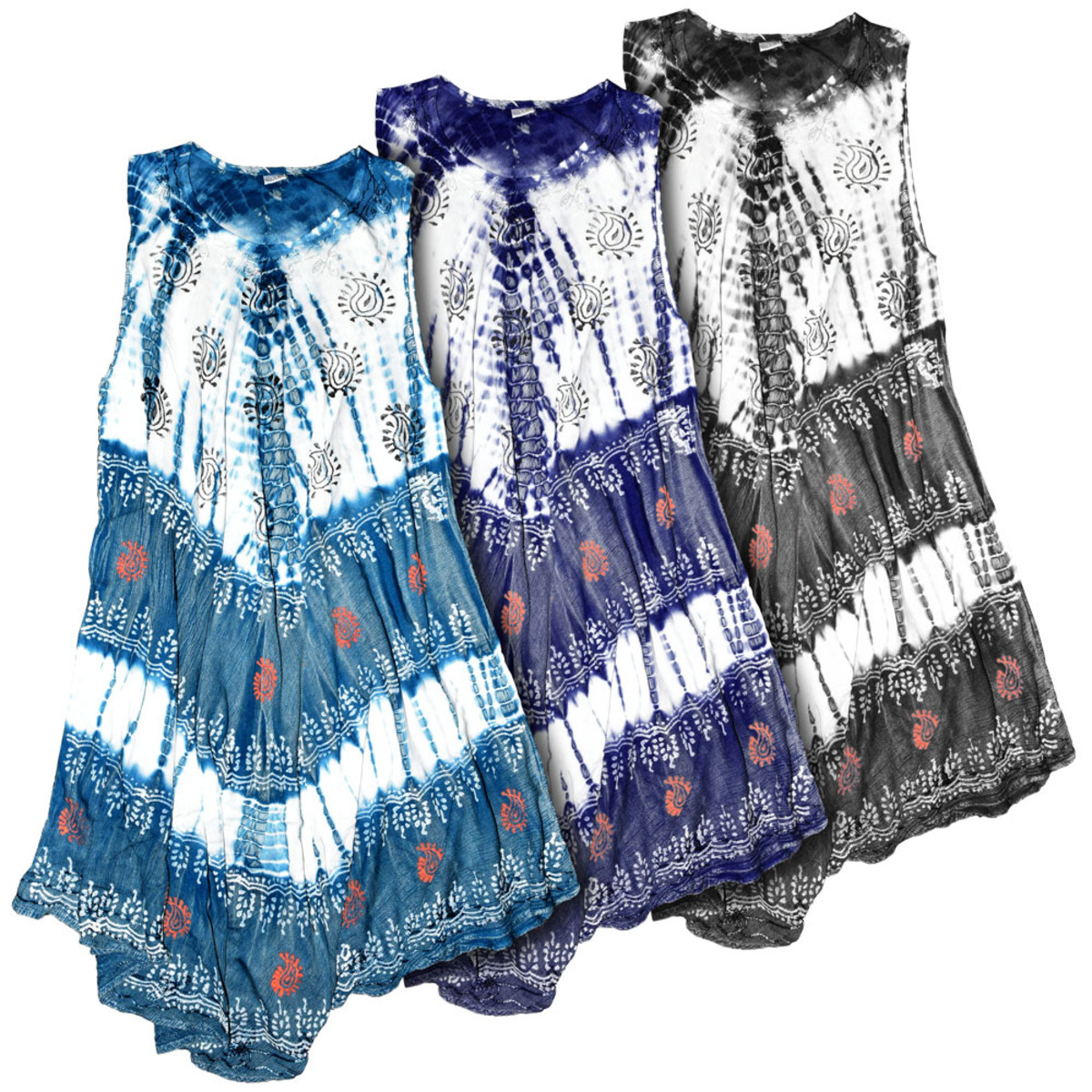 The Color and White Dress features a swoop neck design with wide shoulder straps. These dresses are patterned with a color block tie dye design with embroidery on the neckline. Color assortment may vary from what is pictured.