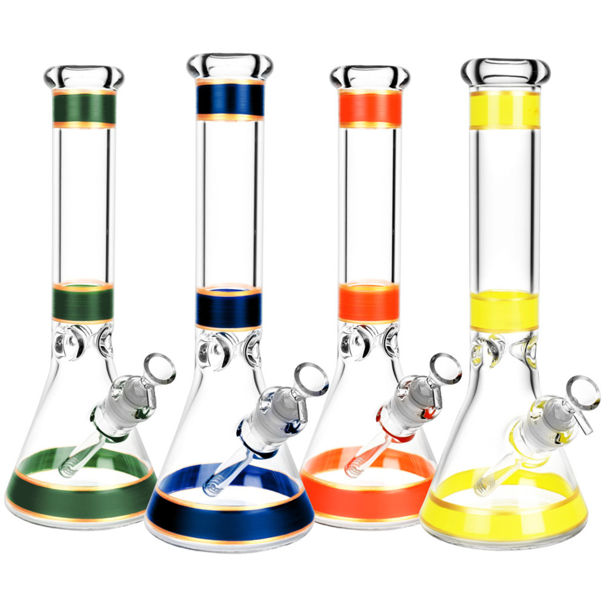 The Color Band Beaker Water Pipe measures 15 inches tall and has a 3 pinch ice catcher for quickly cooling smoke in addition to rich color band accent stripes. These quality boro glass water pipes have a beaker style body and include a slitted downstem diffuser and a 14mm male herb slide with a handle. Colors vary.