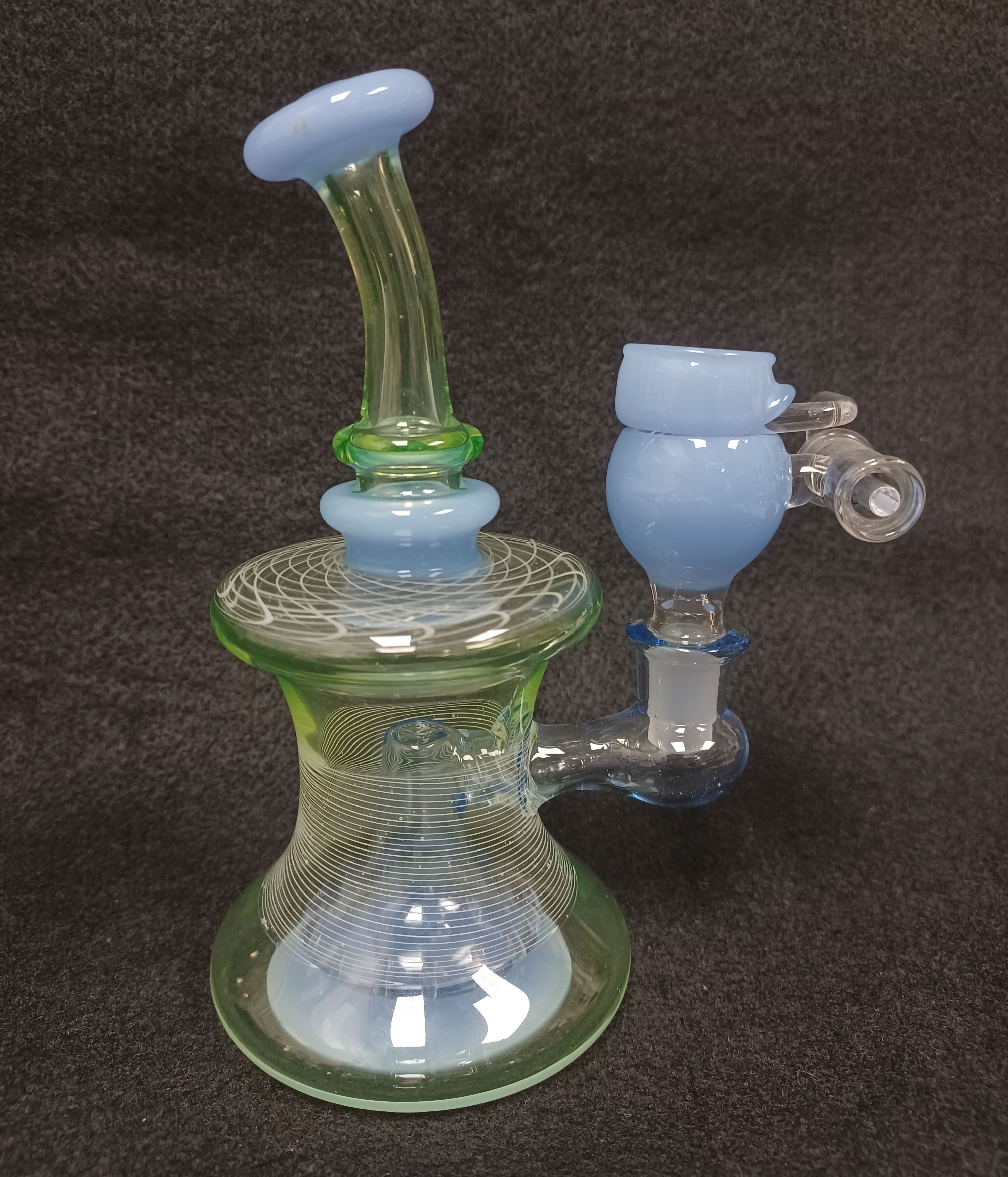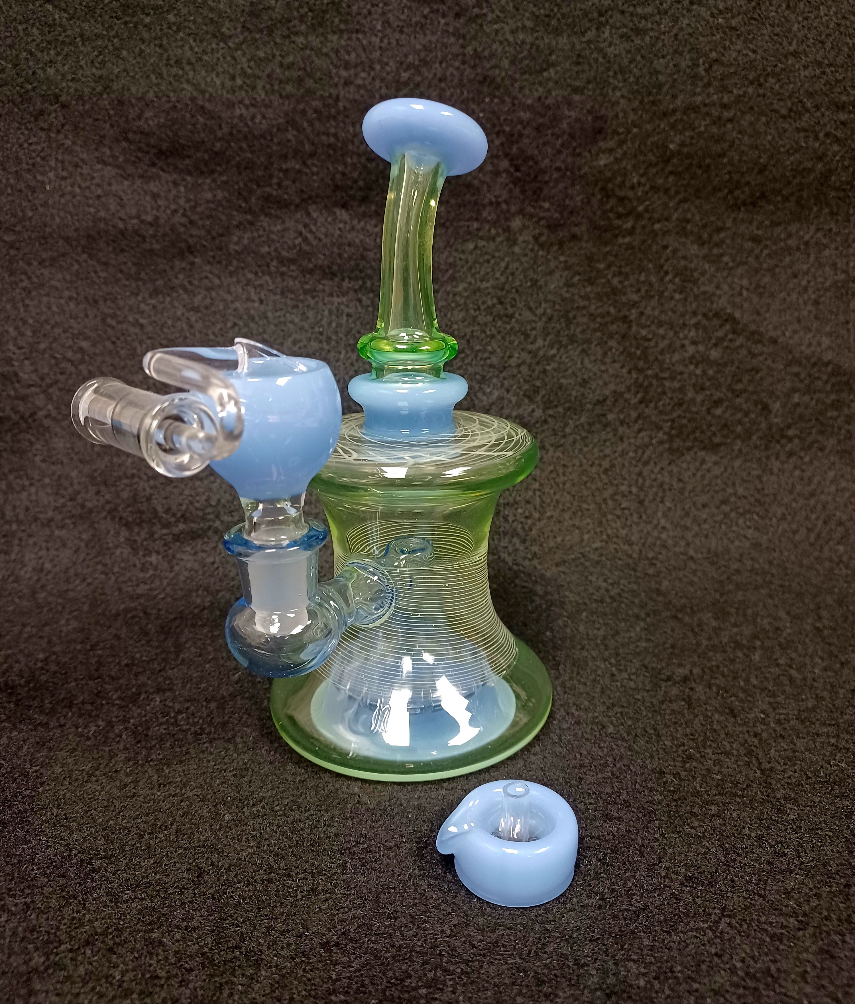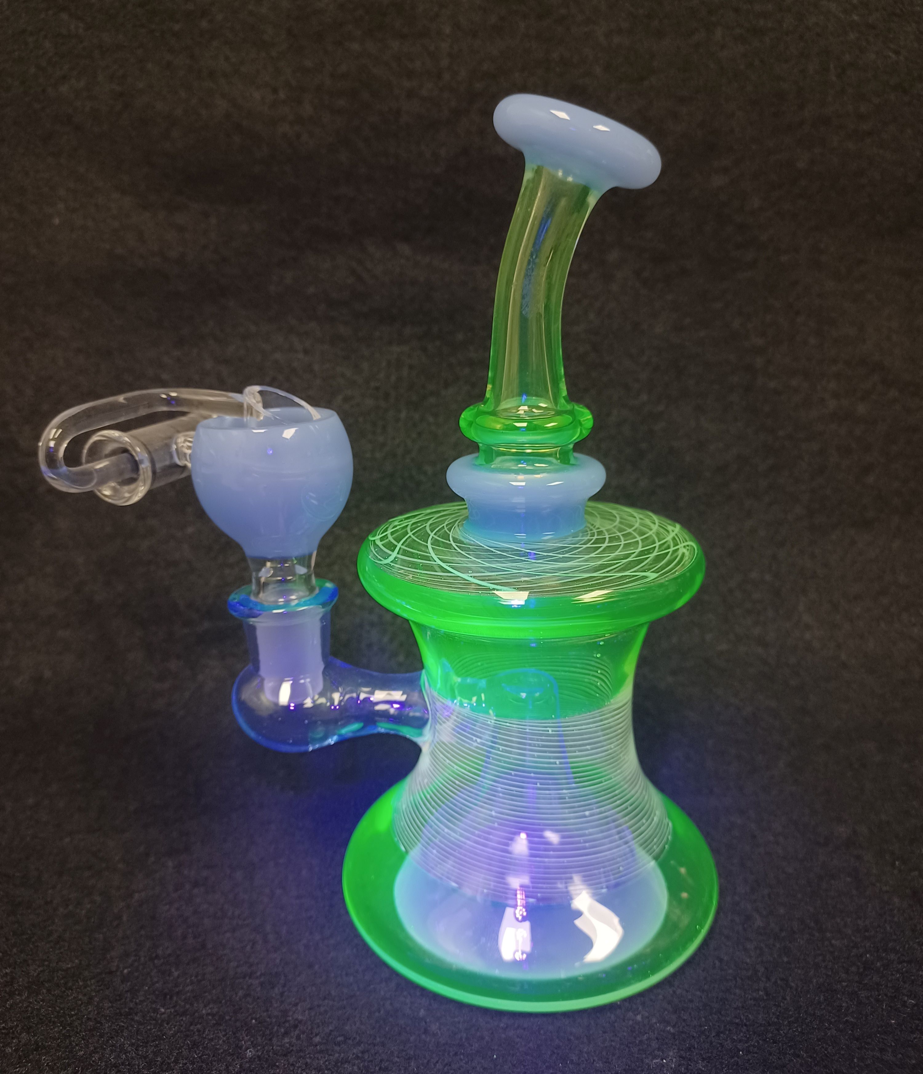 Are you a fan of glowy glass? Check out this banger hanger from Dawnk Glass! This piece comes to life under UV light! This banger hanger is 14mm and comes with a matching honey bucket and cap!