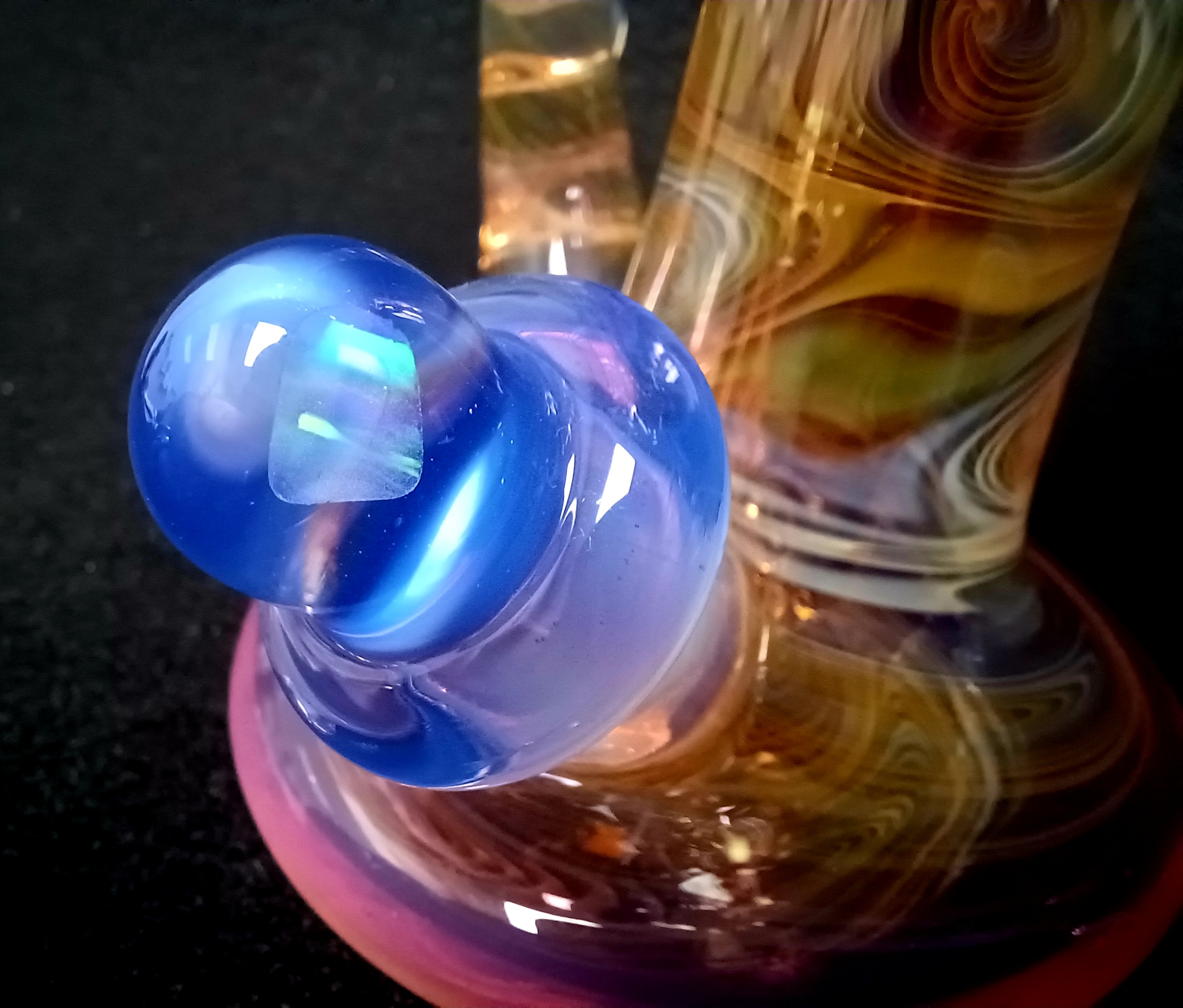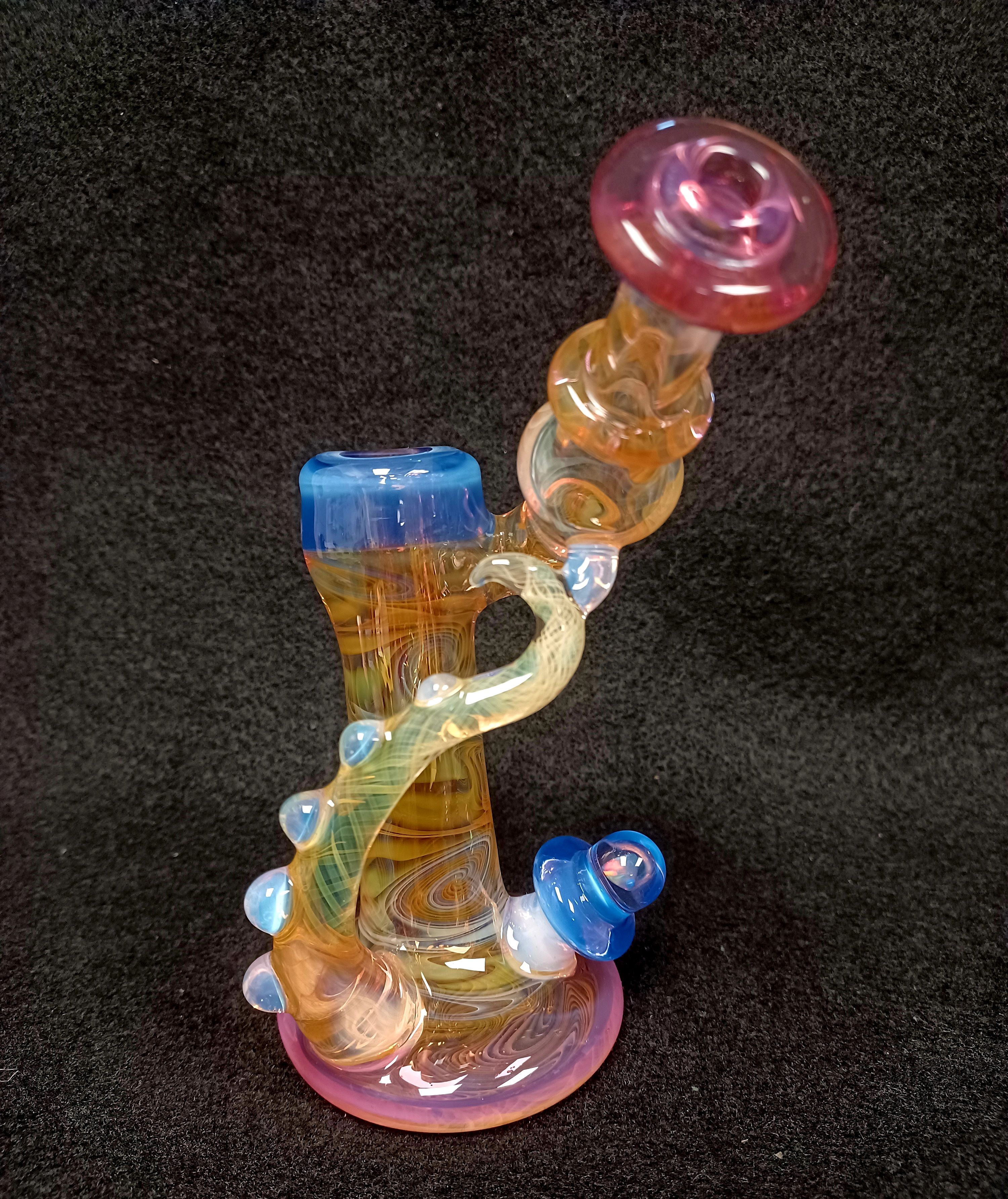 Here we have this cute mini rig from Devo Glass! Stunning fuming work all over this piece. Don’t forget to check out that horn and opal! Size 10mm