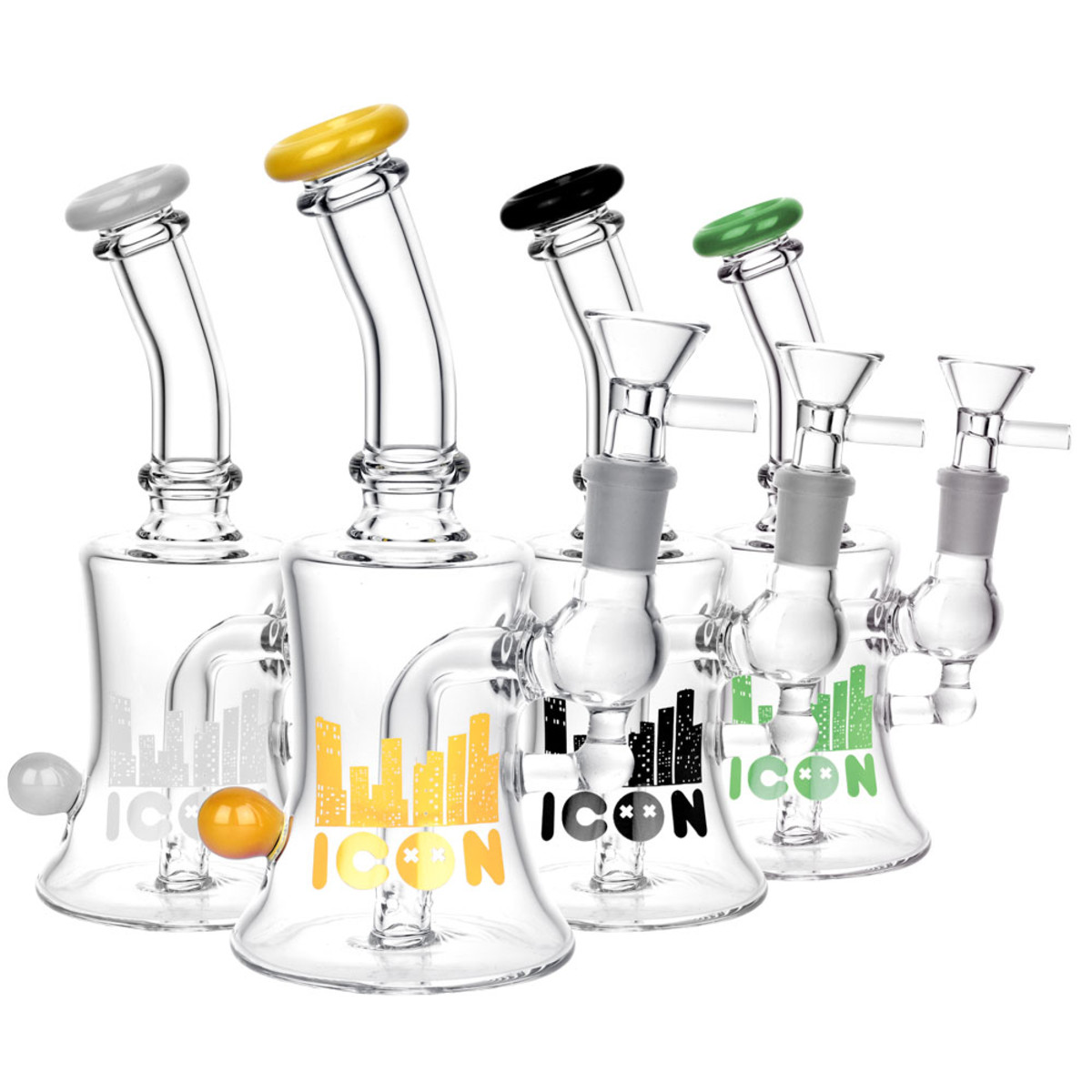 The Icon Baggins Water Pipe from Diamond Glass is hand made in the USA with durable borosilicate glass. Features a bell-shaped base to keep the pipe balanced, fixed diffuser downstem and 14mm female joint. Includes a 14mm male glass herb slide. Pipe stands 7 inches tall.