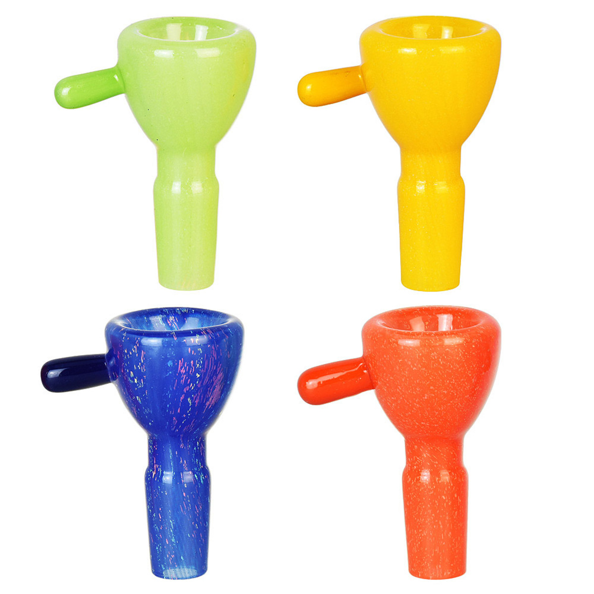 The Dichro Sparkle Fantasy Herb Slidesare thick glass bowls featuring assorted bold, dichro-flecked colors with matching handles. These herb slides are available in 14mm Male joint sizes. Colors vary.