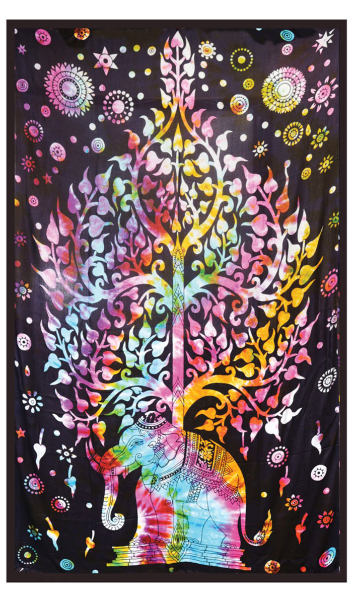 The Elephant Tree Tie Dye Tapestry is half size at 54″x86″ and features an ornate elephant with sacred tree in a swirl of tie dye rainbow color (assorted