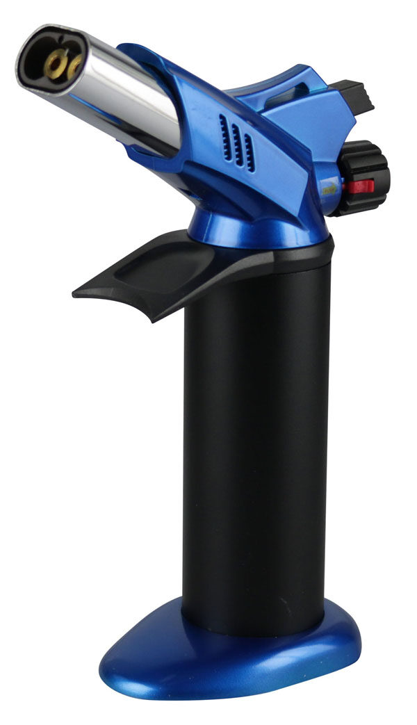 The Ever Tech Torch Lighter is a refillable butane torch that stand 6″ tall and features 2500º twin turbo flames, piezo self-ignition, precision flame control, and a lock switch and base for hands-free operation.