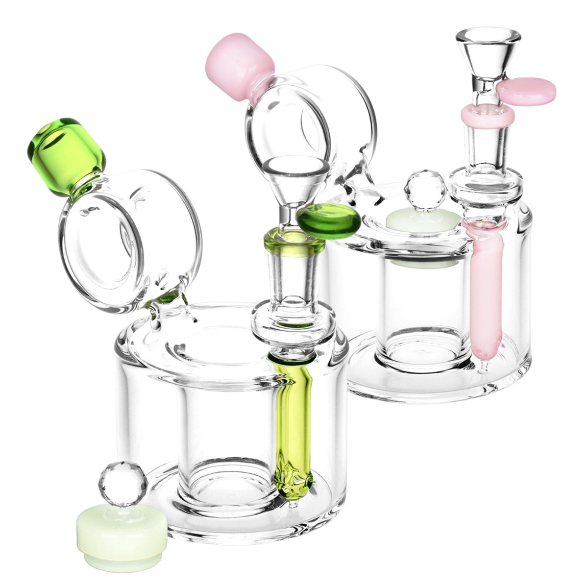 These unique water pipes have a double donut design with a fixed downstem. The center of the base donut functions as built-in herb storage with a glow in the dark lid with a gem cut handle. The pipes include a 14mm male herb slide with a handle. Measures 5.5 inches (14cm) tall. Colors vary.