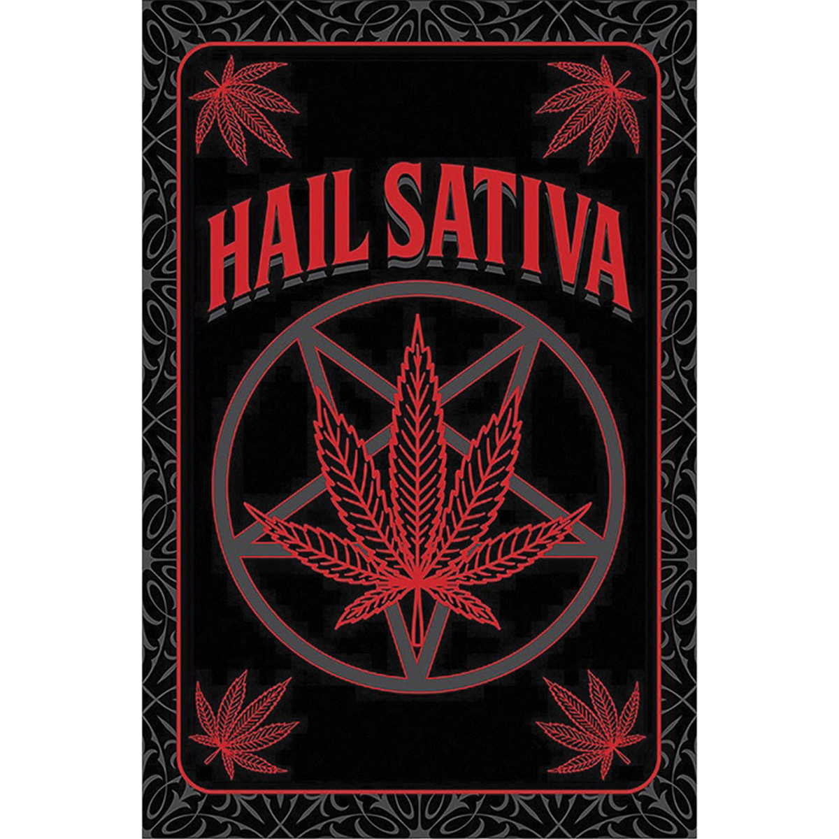 The Fujima Hail Sativa Tapestry measure 50 inches by 78 inches (127cm x 198.1cm). The tapestry features a black and red pentagram design with hemp leaf accents and the words “Hail Sativa” in bold, red letters.
