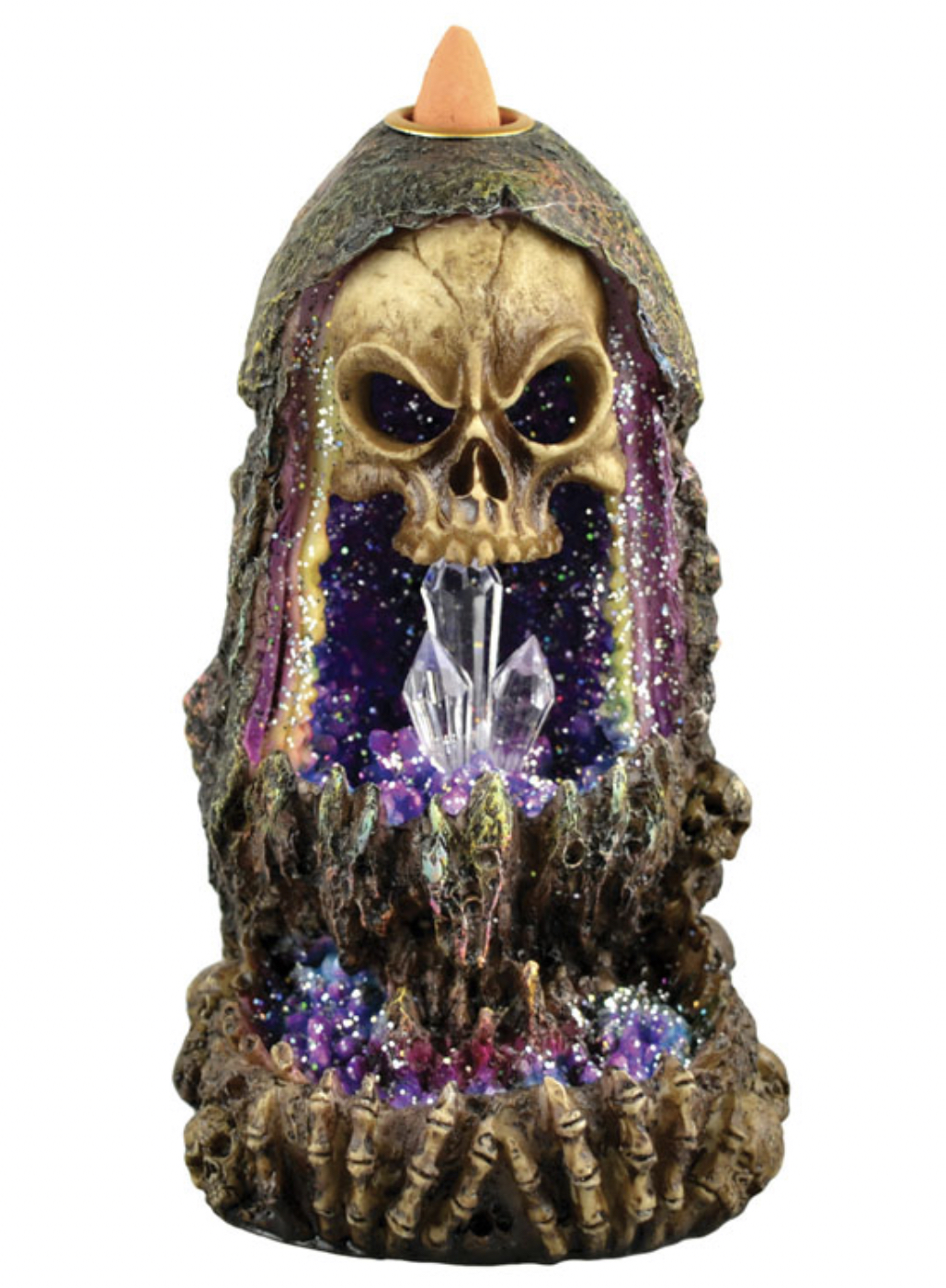 This mystical and spooky skull on top of geode incense burner is specifically made for Backflow incense cones.
