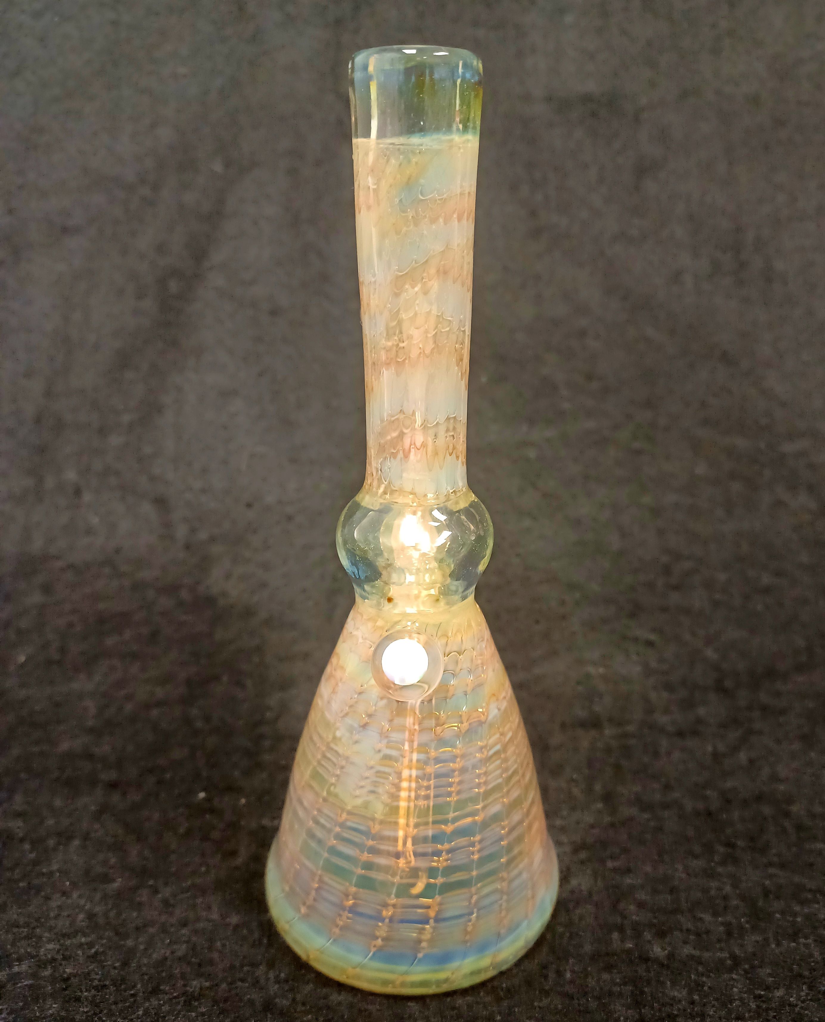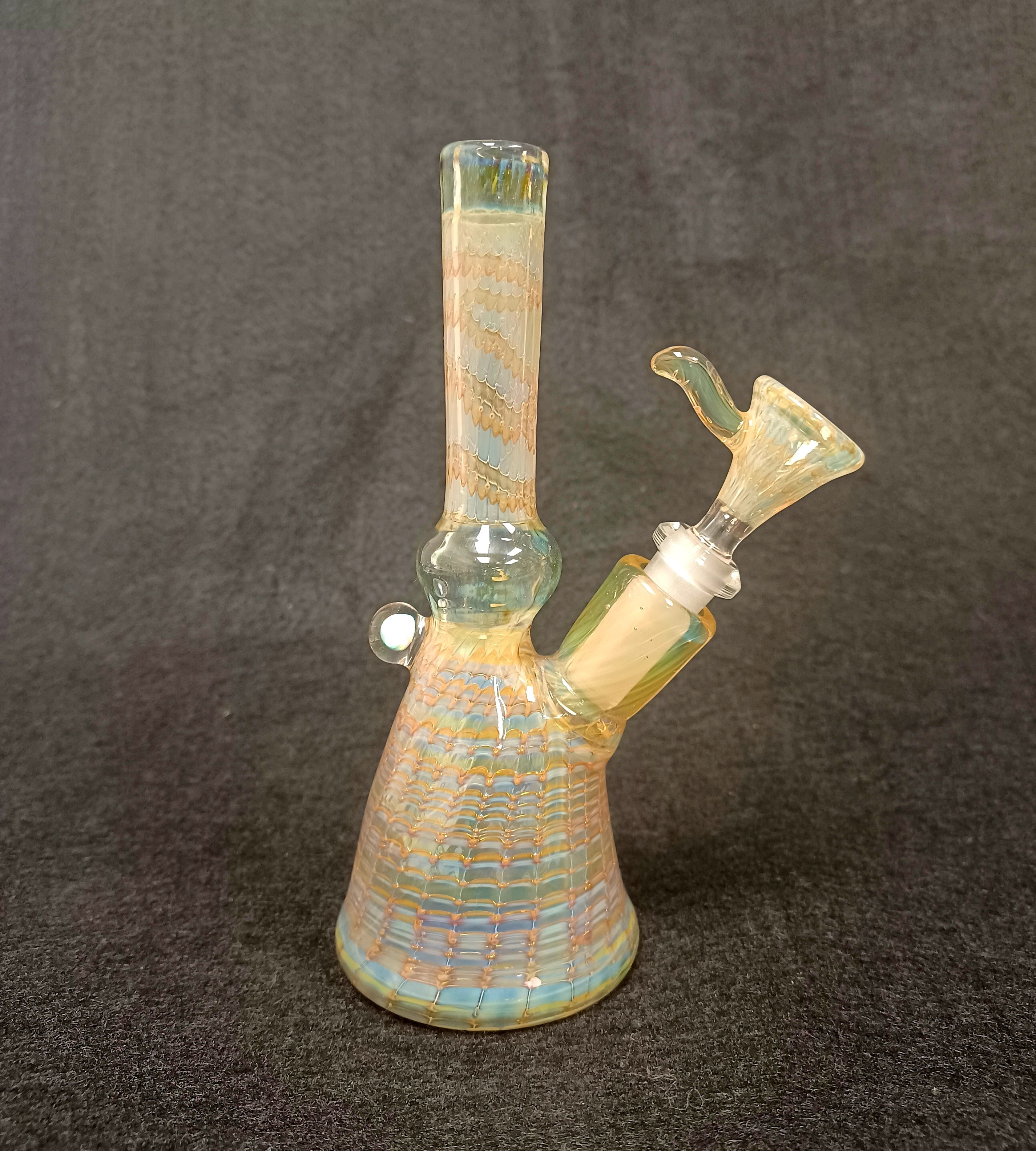 Here we have another gorgeous fumed mini beaker from Good Home Glass. Tons of fuming and wrap and rake work done to this piece, with a beautiful opal on the back! This piece is 10mm and comes with a matching slide!