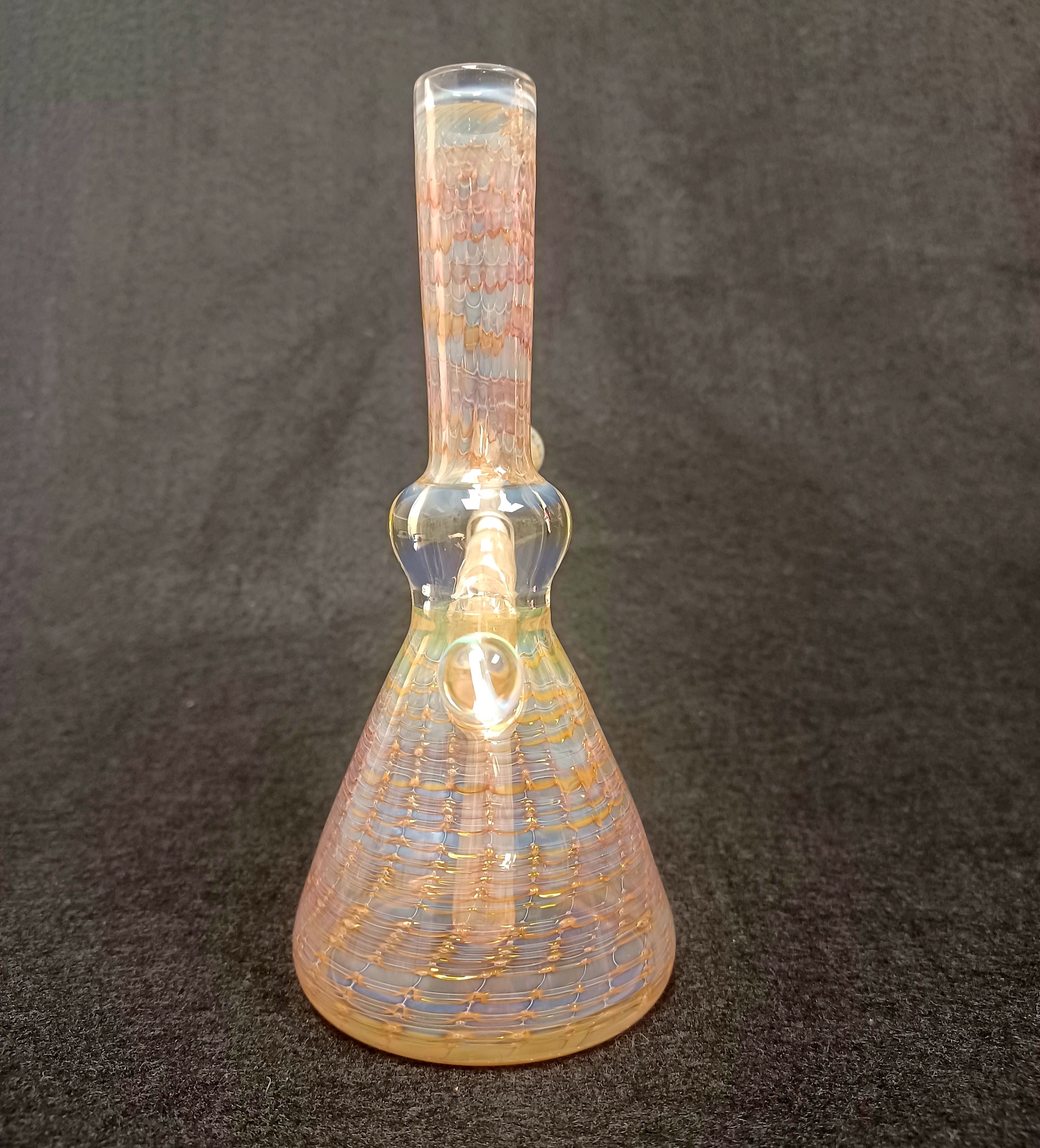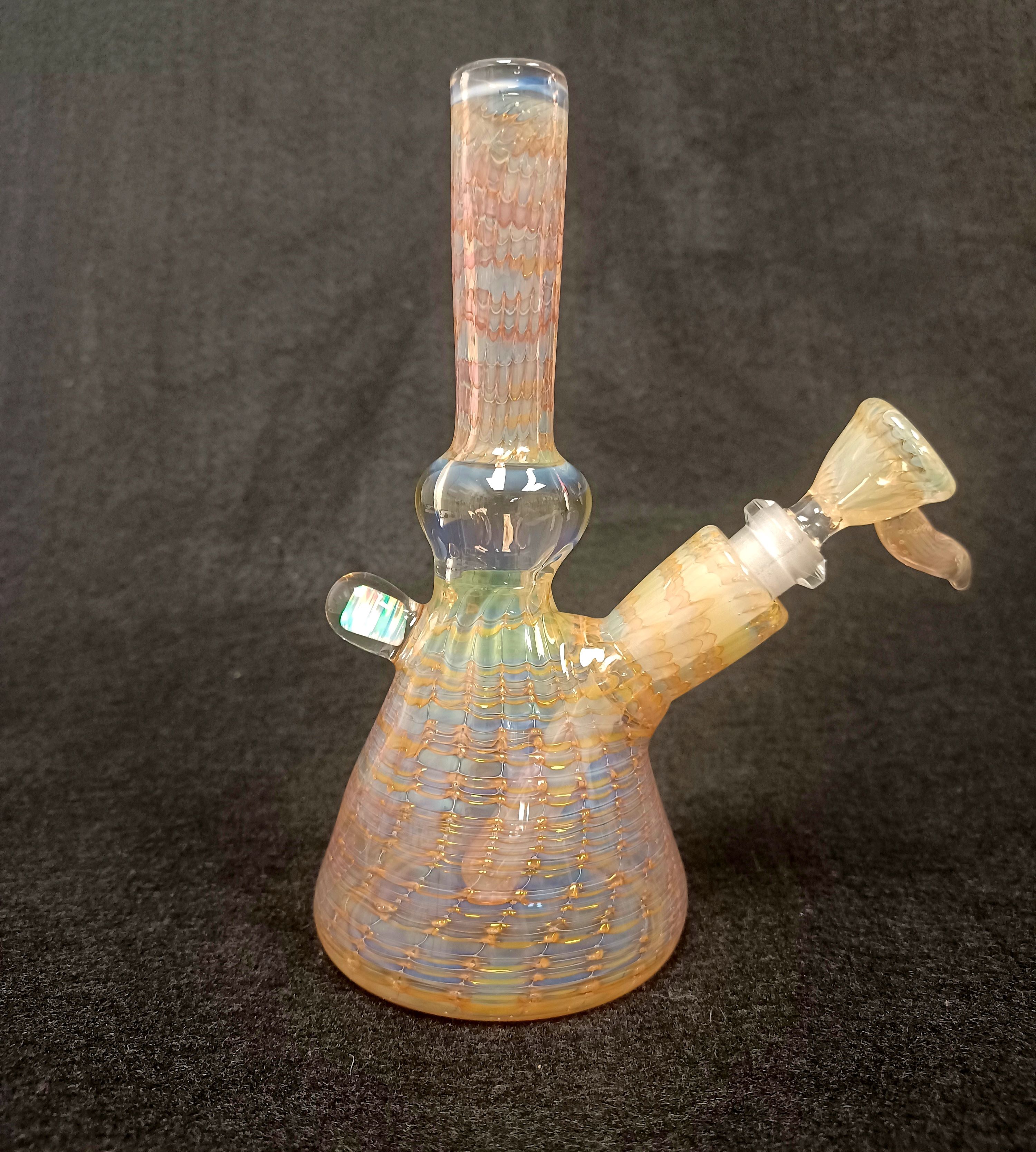 Look at this mini tube from Good Home Glass! This piece has tons of fuming and gorgeous wrap and rake work on it! You can’t beat that exceptional opal on the back of the piece either! Size 10mm and comes with slide.