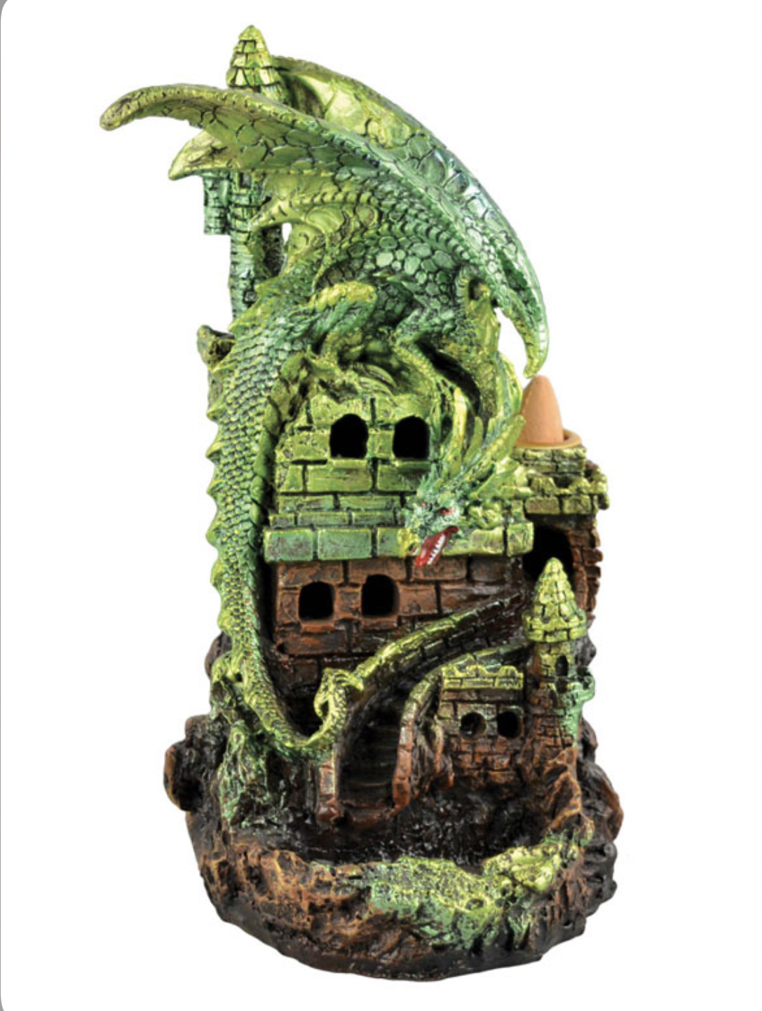 This whimsical Backflow burner features a green dragon takeover of a castle! Specifically made for Backflow cones, watch as the smoke billows out over the castle!
