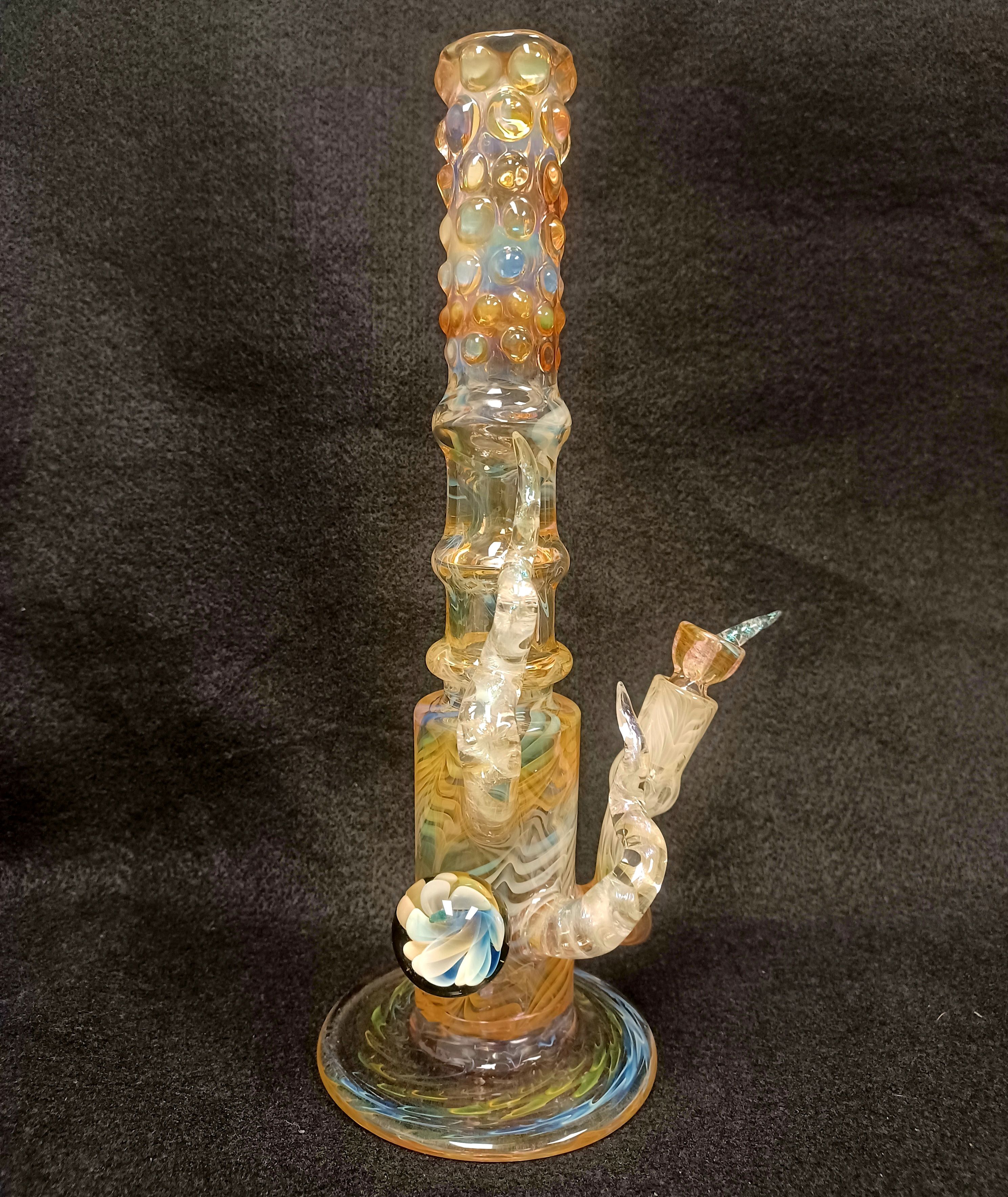 I Love Frank Glass did an amazing job on this tube! Look at all that incredible fuming work! The horns and flower marble really add to this piece! Size 14mm and comes with a matching slide.