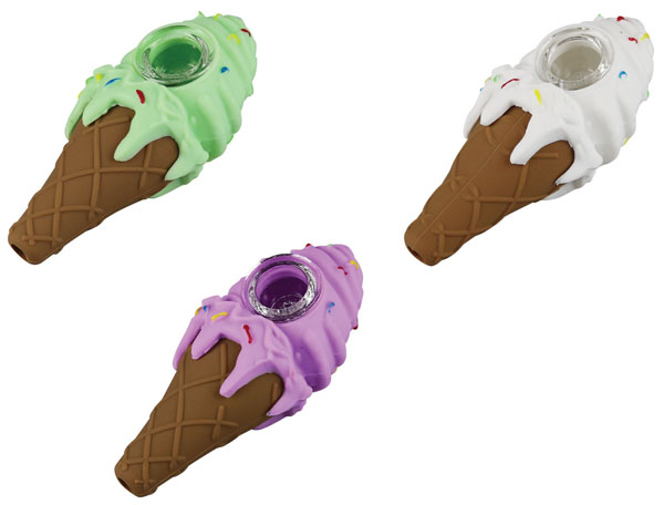 The Ice Cream Cone Silicone Handpipe is a fun silicone hand pipe shaped like a tasty ice cream cone treat decorated with colorful sprinkles. The pipes have a two-part design and a removable borosilicate glass bowl that makes them easy to clean. Made with non-toxic food grade silicone. Measures 4.5″ long. The pipes come in assorted ice cream colors that may vary from pictured.