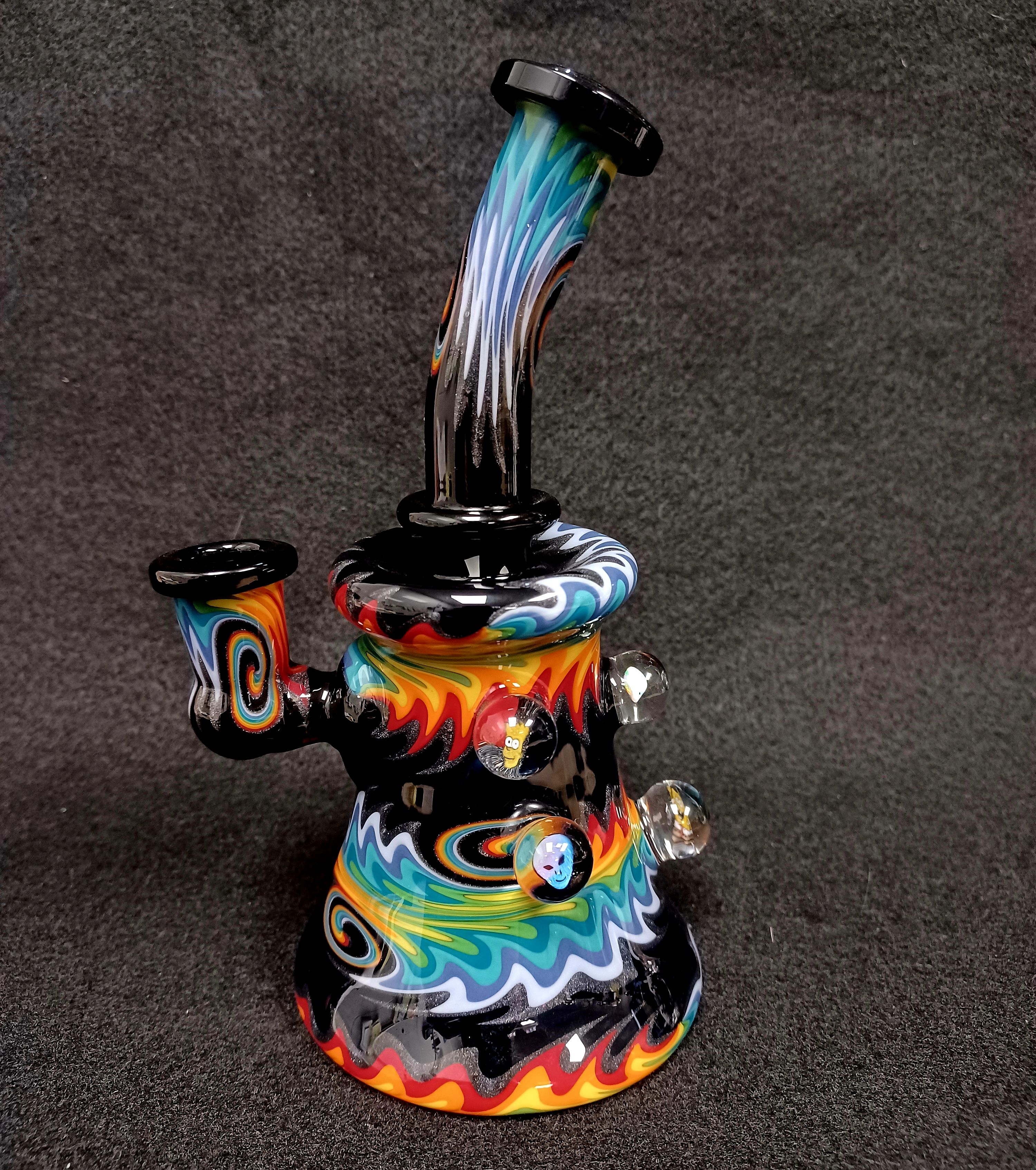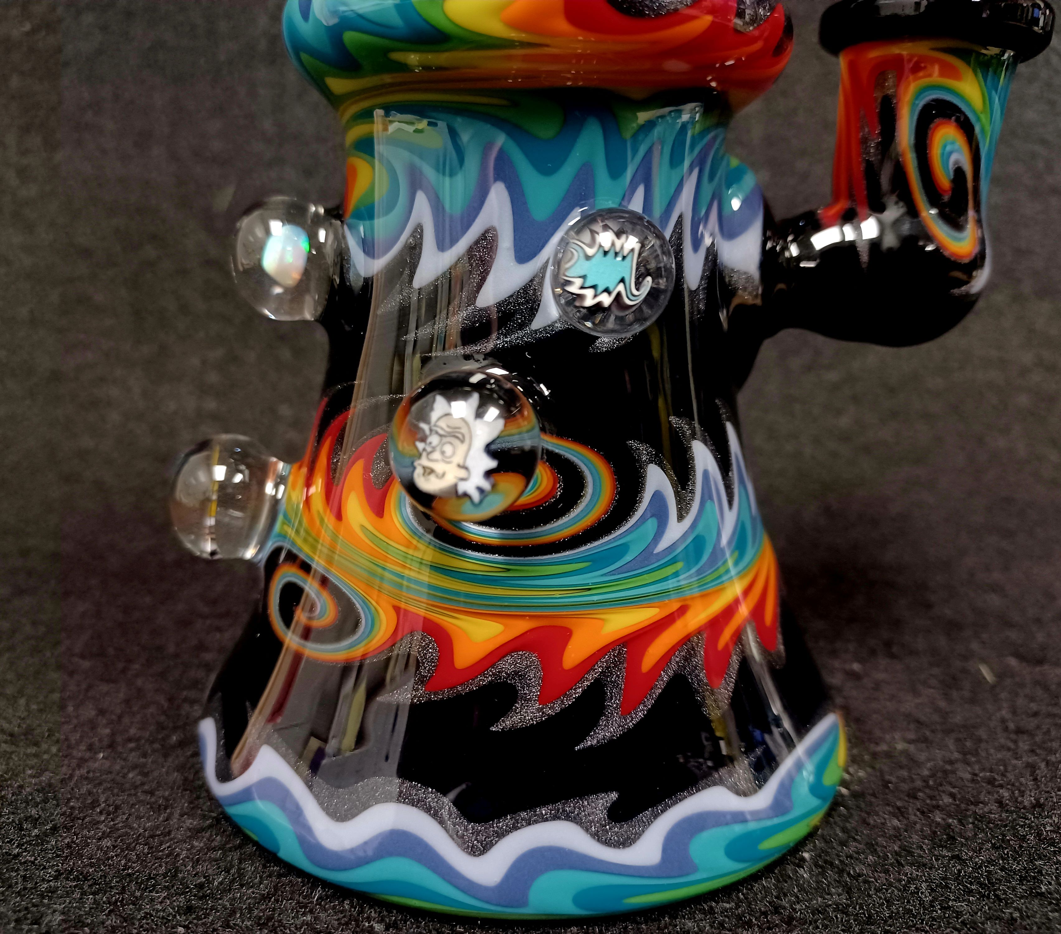 Are you a fan of wig wag? Well, look no further, this rig is full of it! Jemmie glass killed it this banger hanger. To top it off, there is multiple millie chips and an opal on the sides of the piece. Size 10mm
