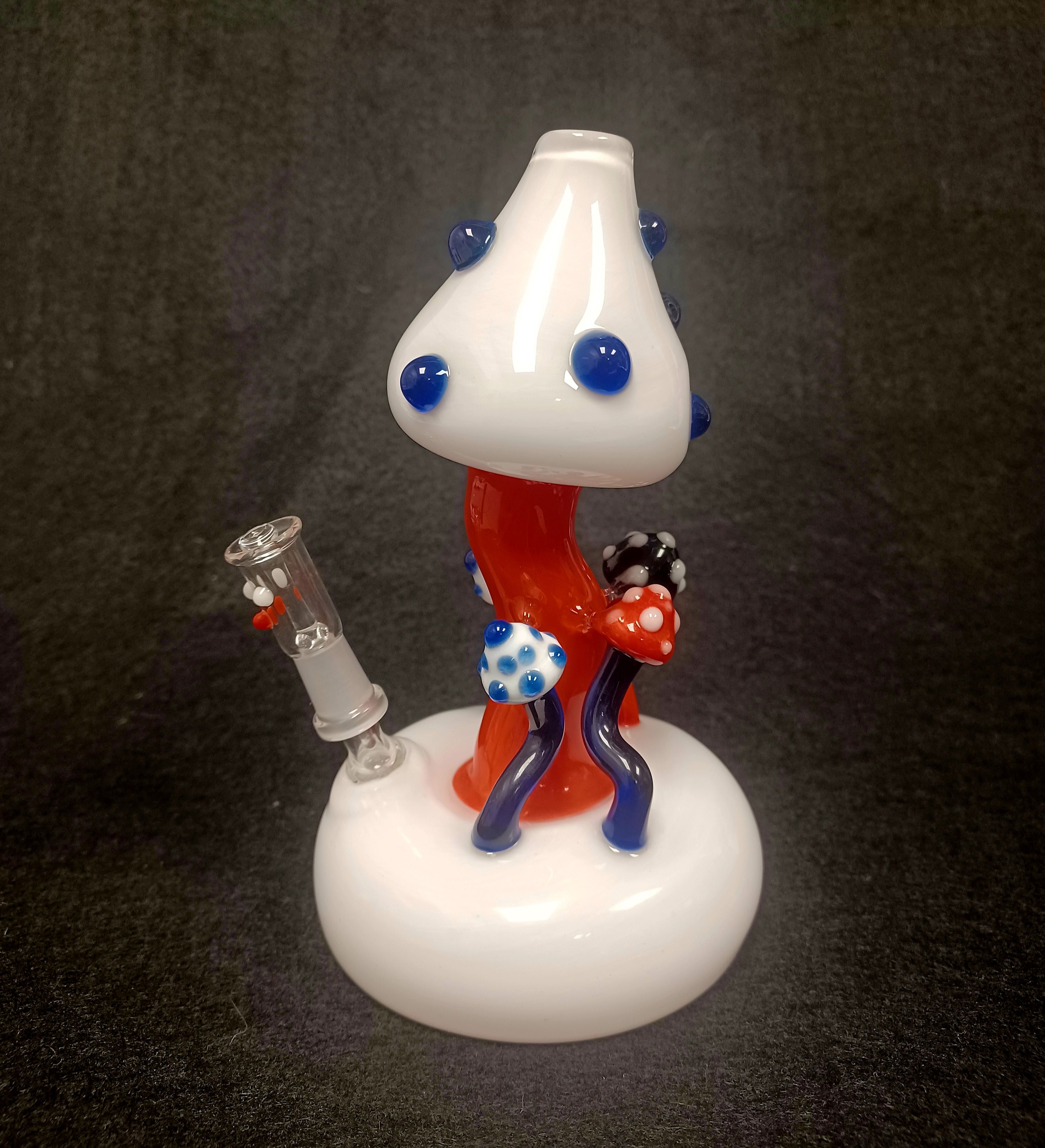 Here we have this adorable rig from Joint Forces Glass. Shaped like a mushroom with lots of little mushrooms all over the piece! This piece is size 10mm male, and comes with a nail and dome set up and a Quave banger!