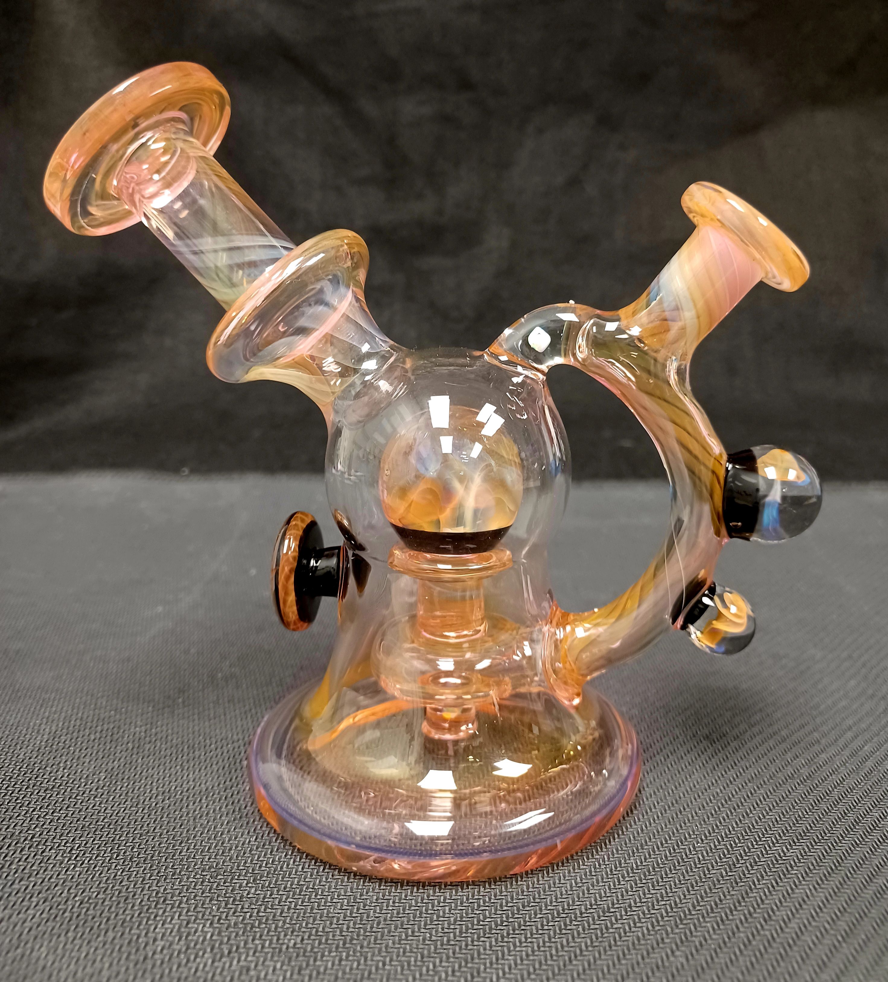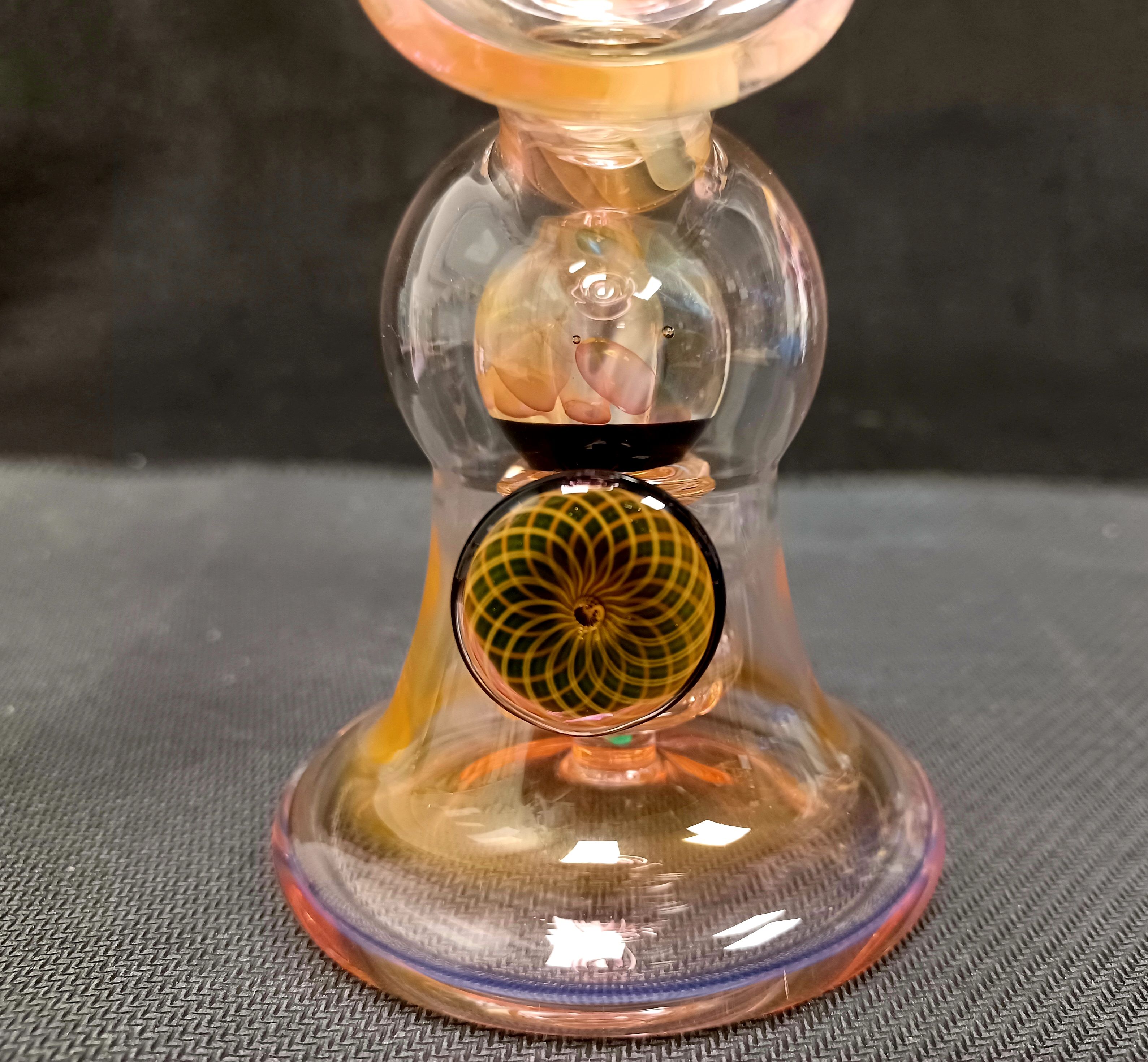 Are you a big fan of fumed glass? Check out this piece from Kaliber Glass! Tons of fuming and wrap and rack work throughout the rig! You really can’t beat the sparkling opals and marbles decorating the piece either! Size 10mm