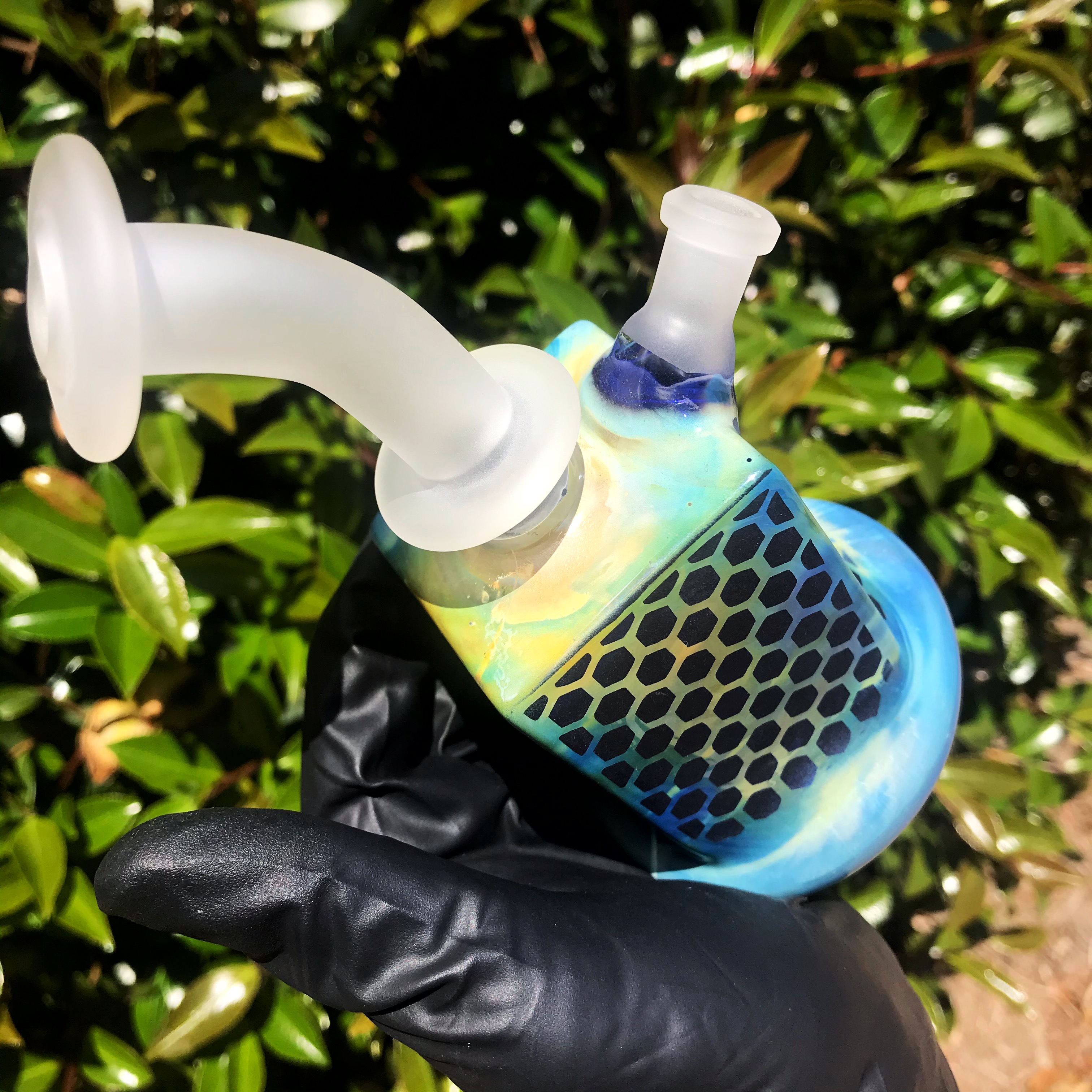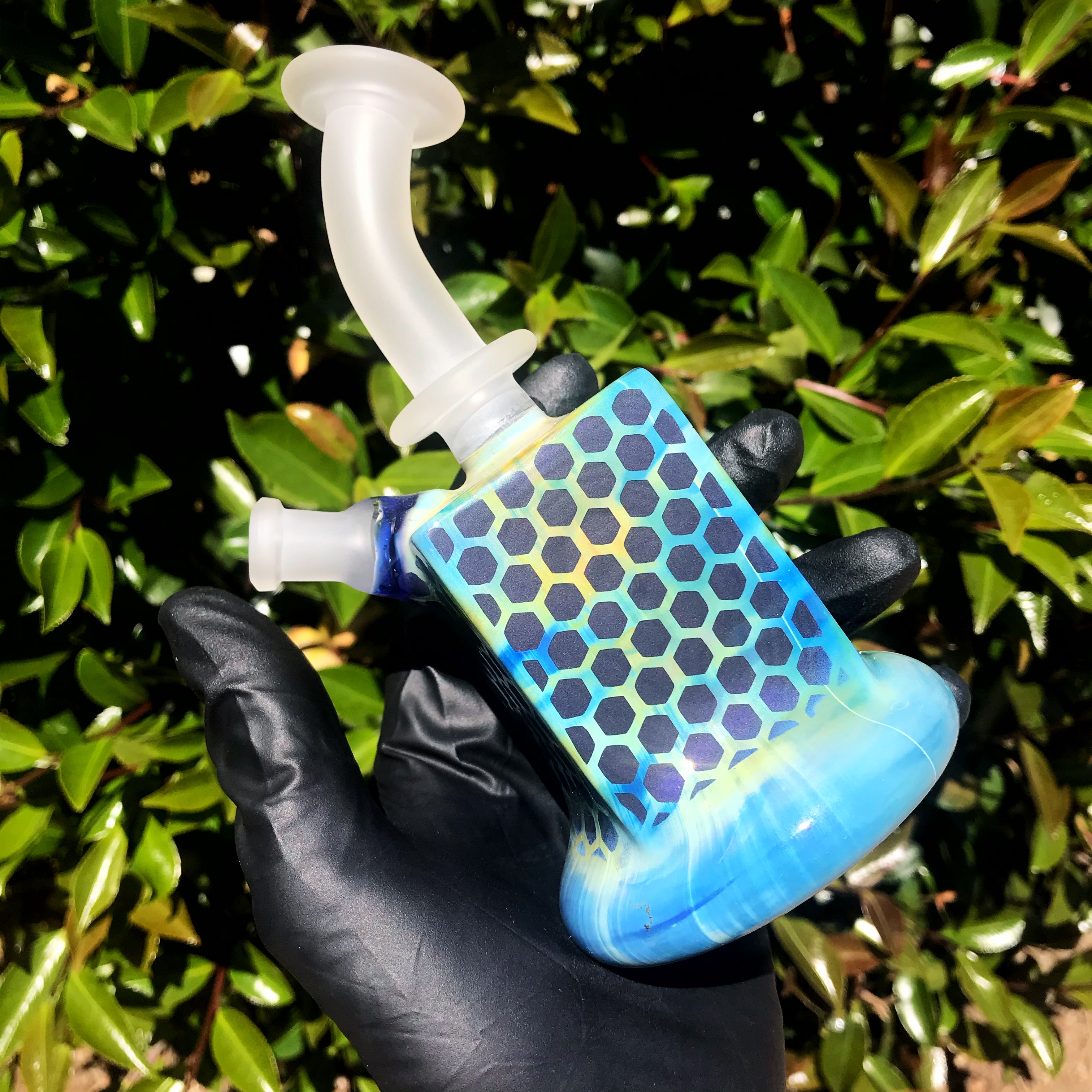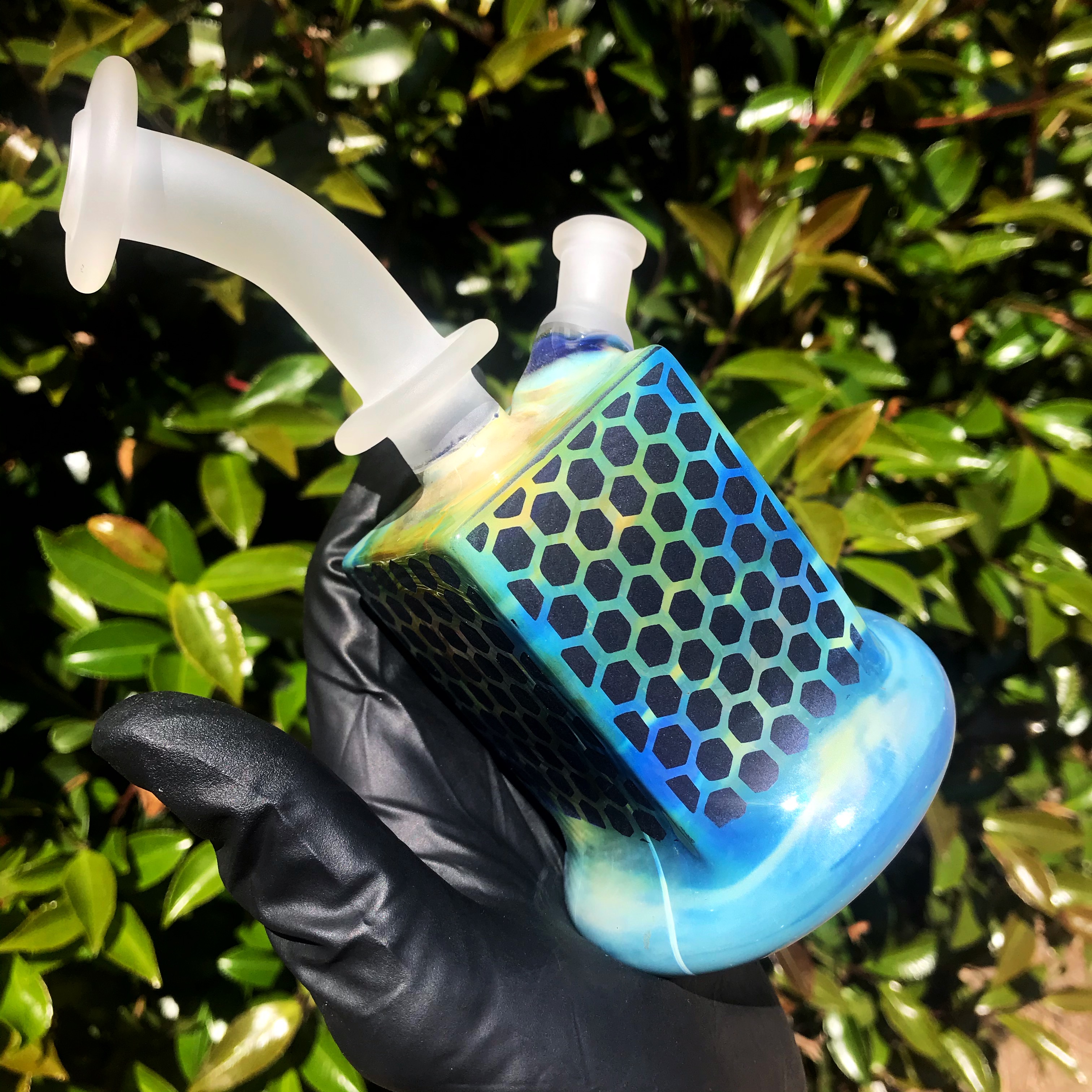 This rig from Lang Glass is square shaped, with fume honeycomb techniques, sandblasted, and contains a 10mm joint!
