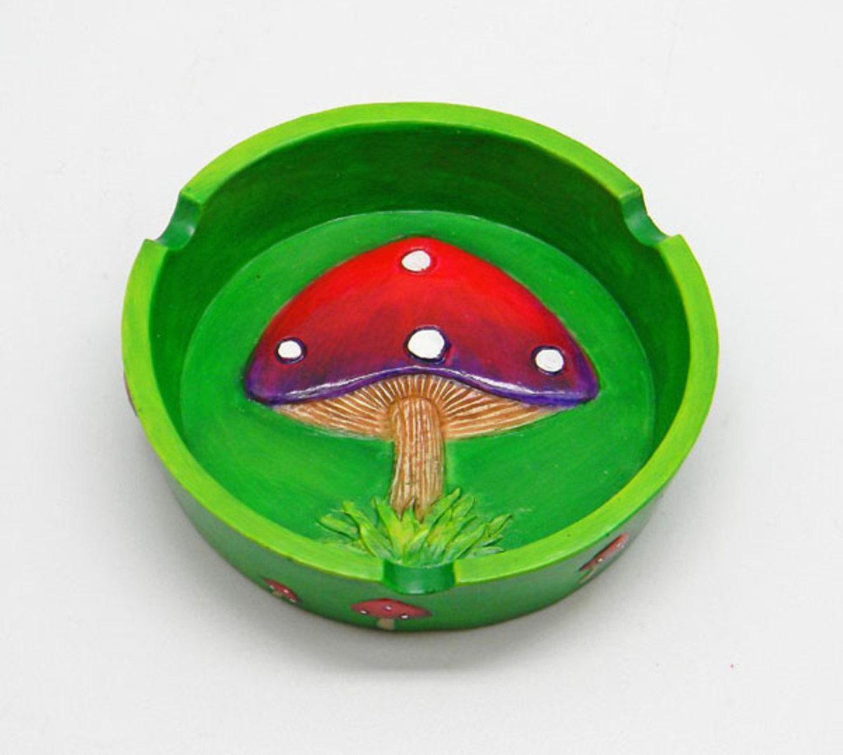 The Mushroom Ashtray is a novelty cigar, cigarette, and pipe tobacco disposal bin made of synthetic materials. A classic fairy toadstool mushroom design adorns the inside of this grass green ashtray.