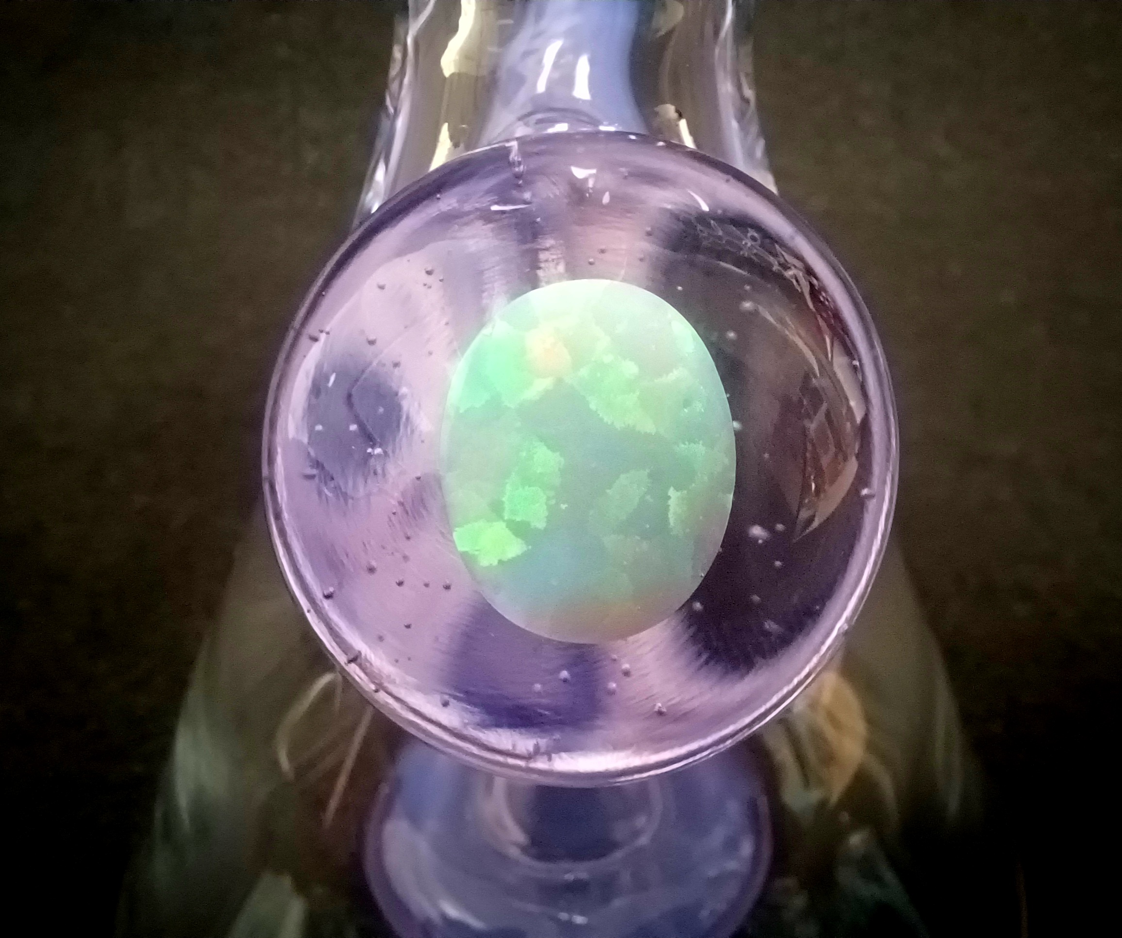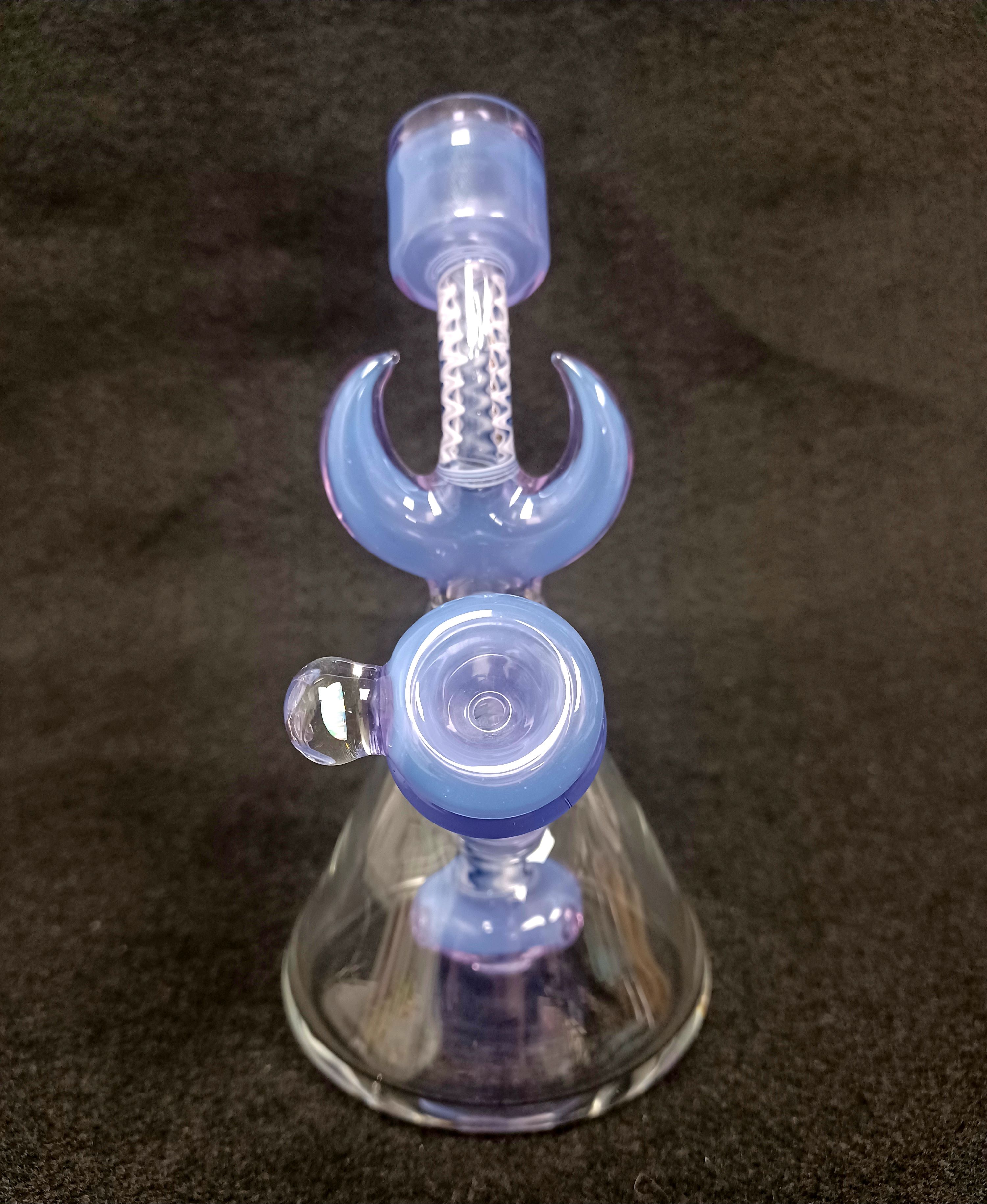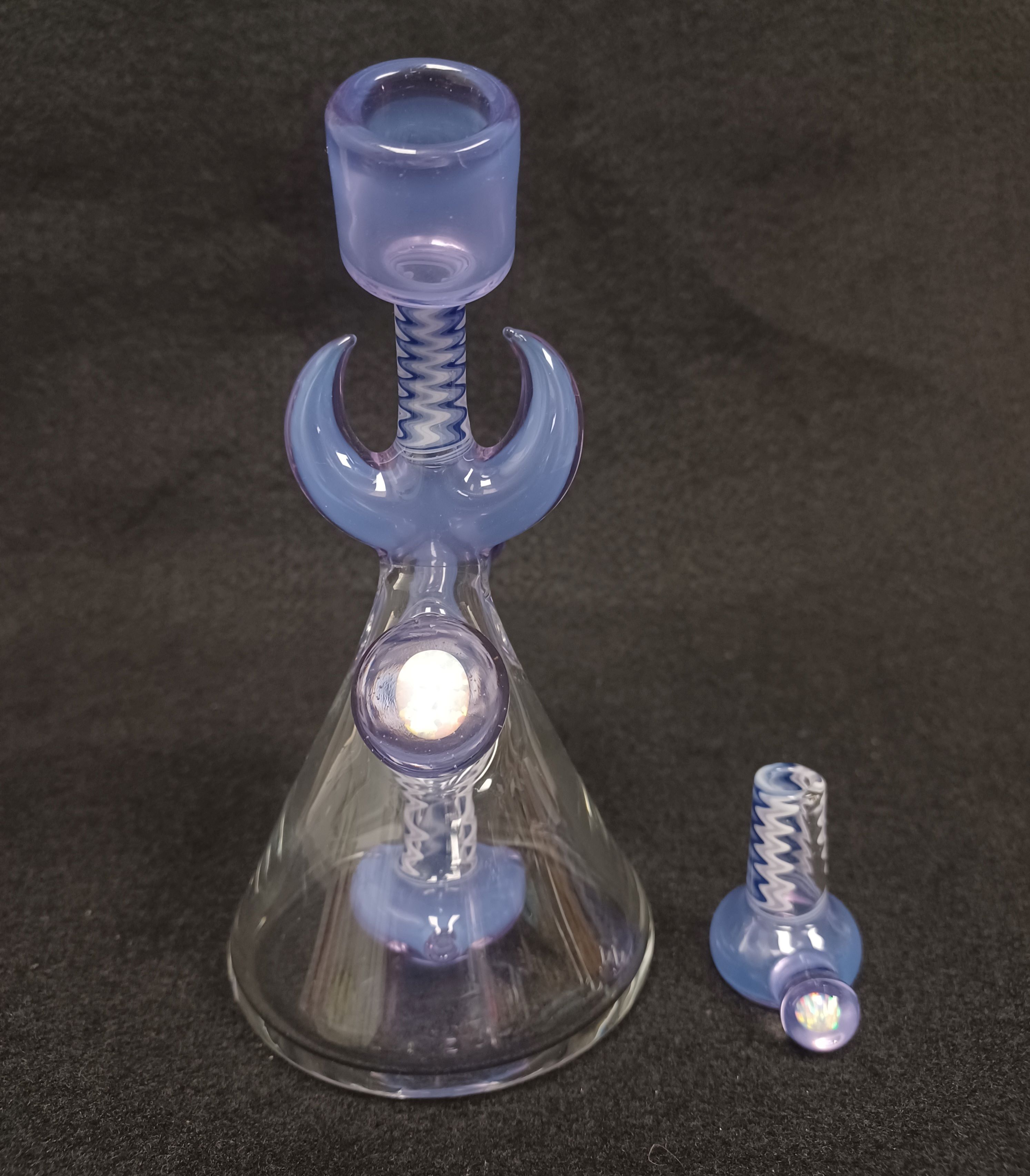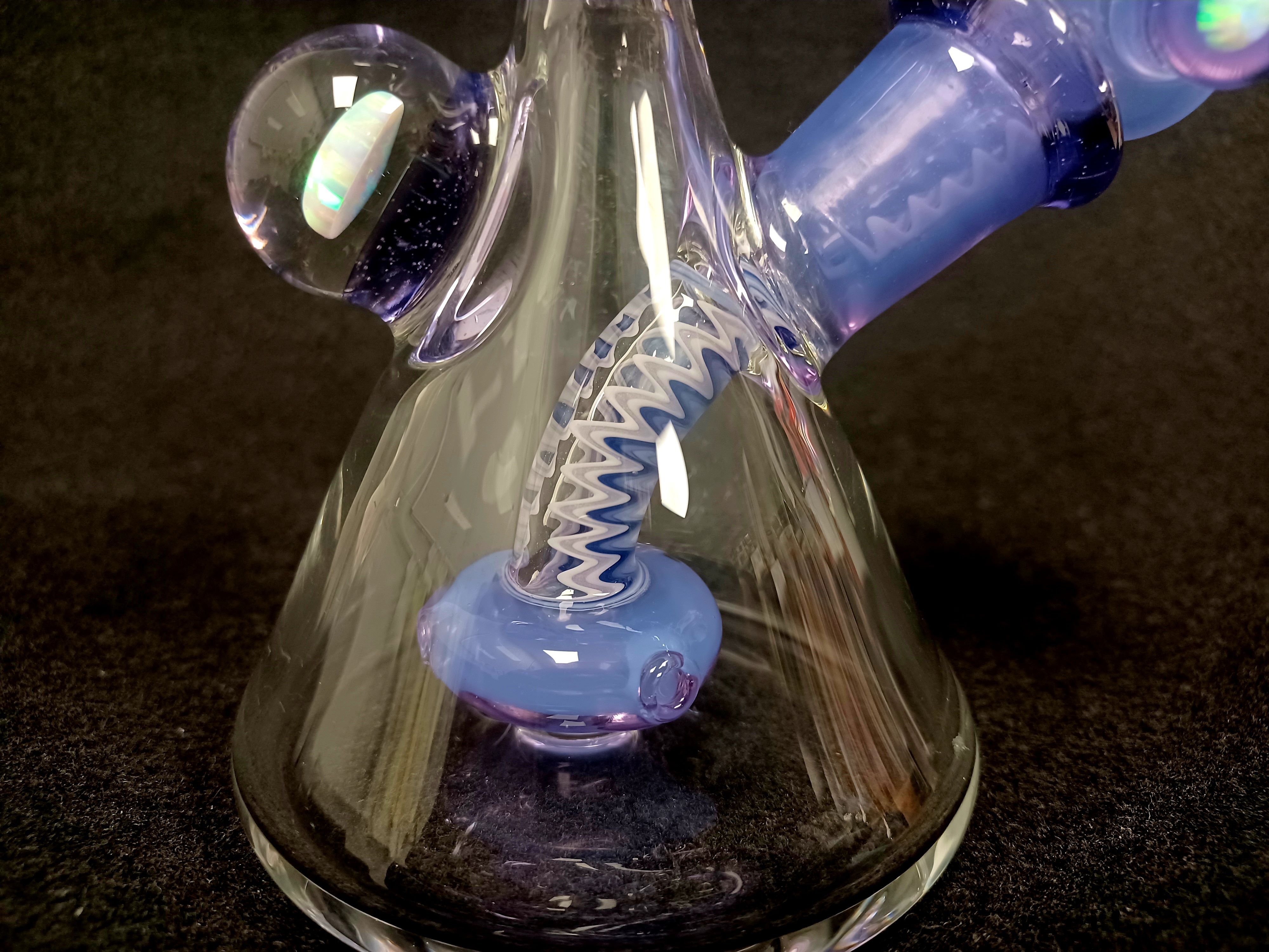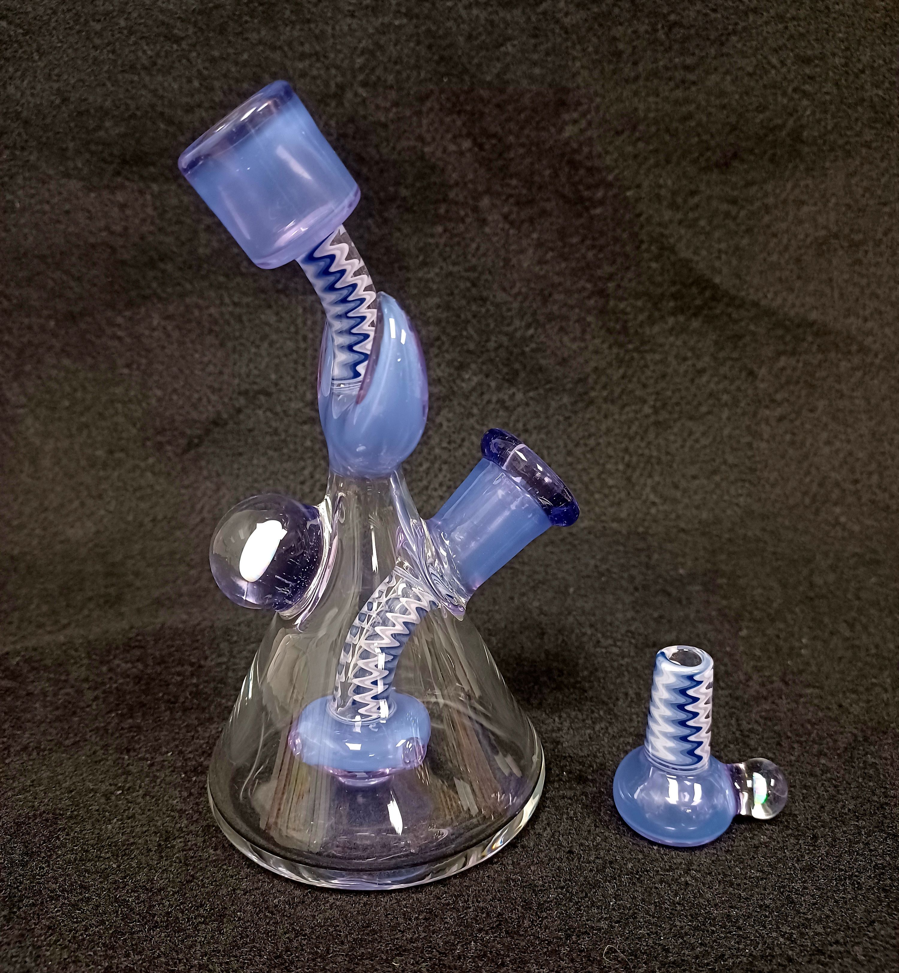 Look at this beauty! Natey Love did such a great job on this piece. Tons of wig wag zippers on the piece and slide! Don’t forget about the opals! Made with purple rain with a showerhead perc. Size 14mm and includes a matching slide.