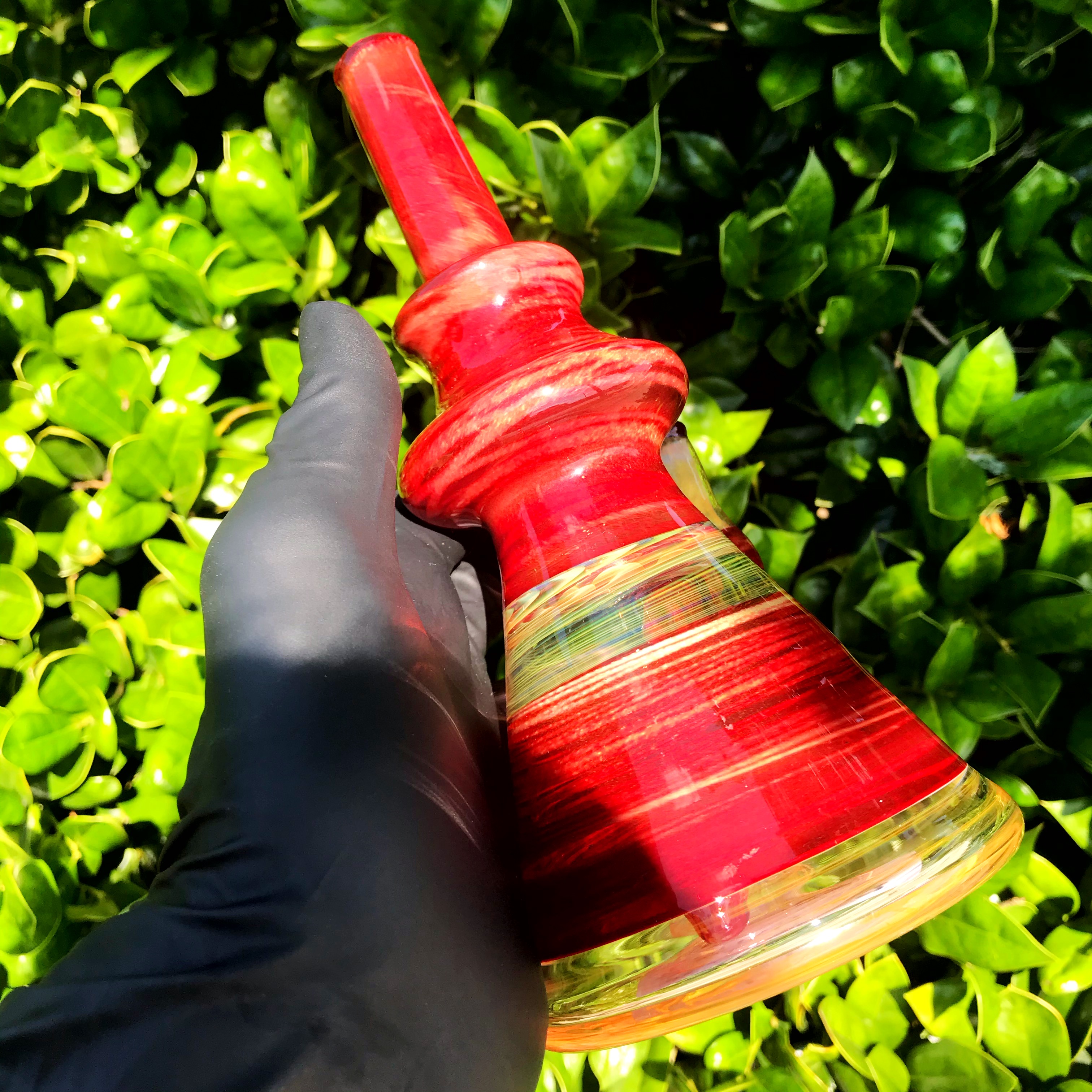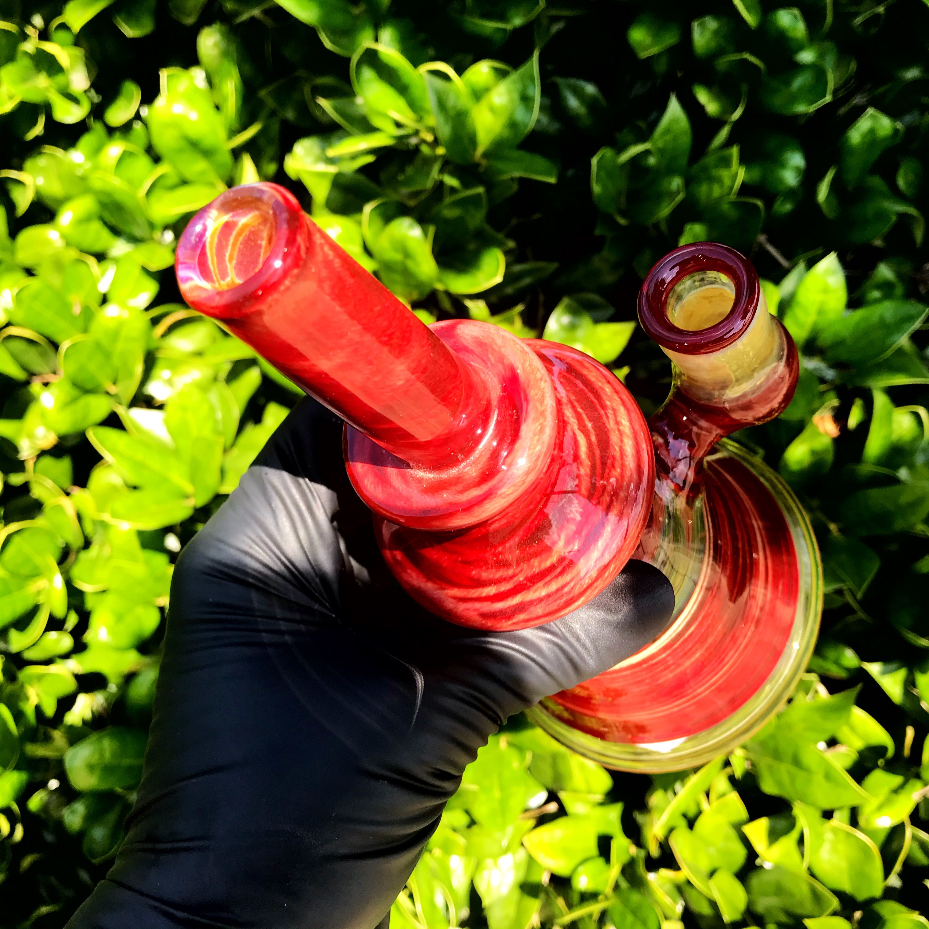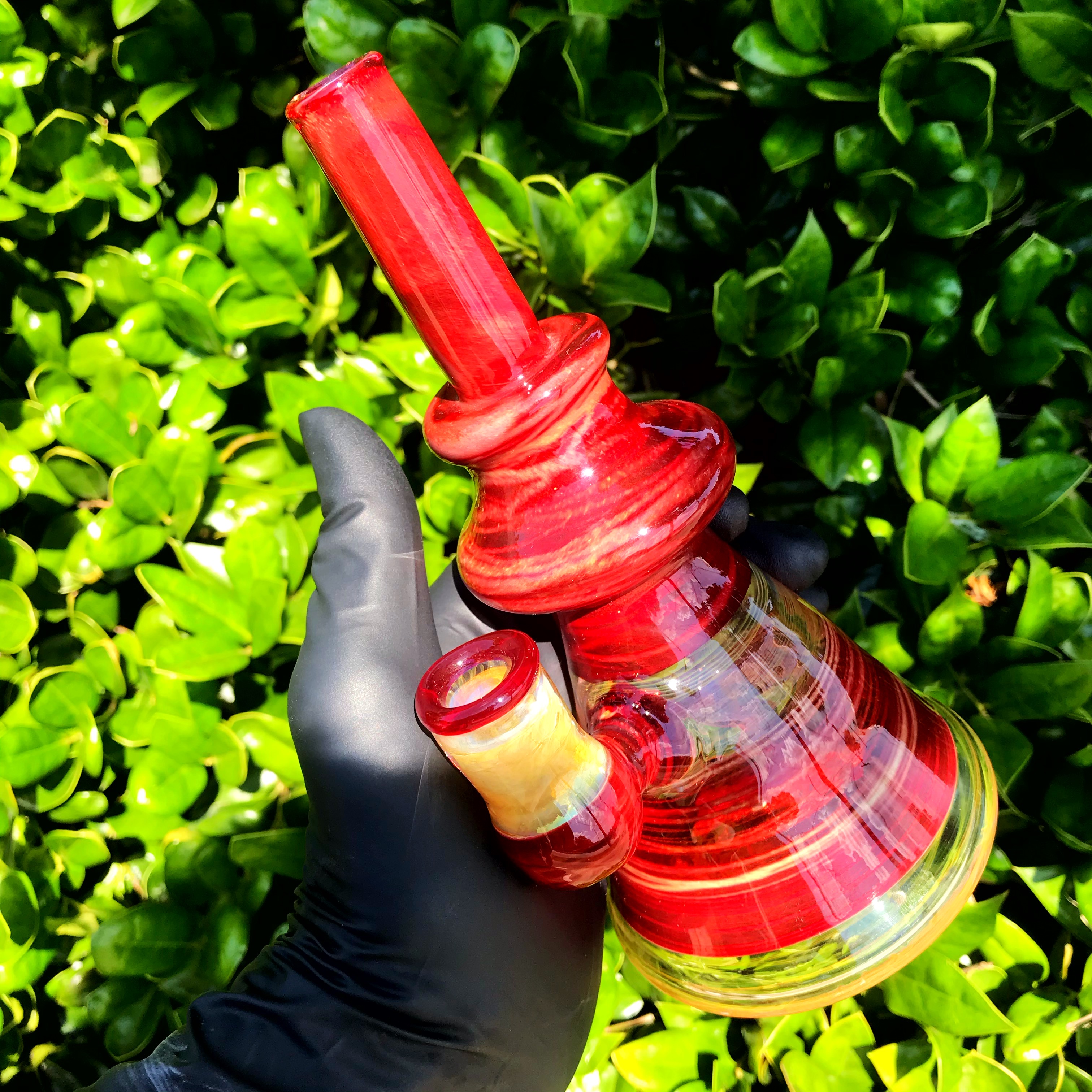 This Crimson and Fumed beaker from Piratt Glass is perfectly shaped, has a fixed downstem, and a 14mm joint!