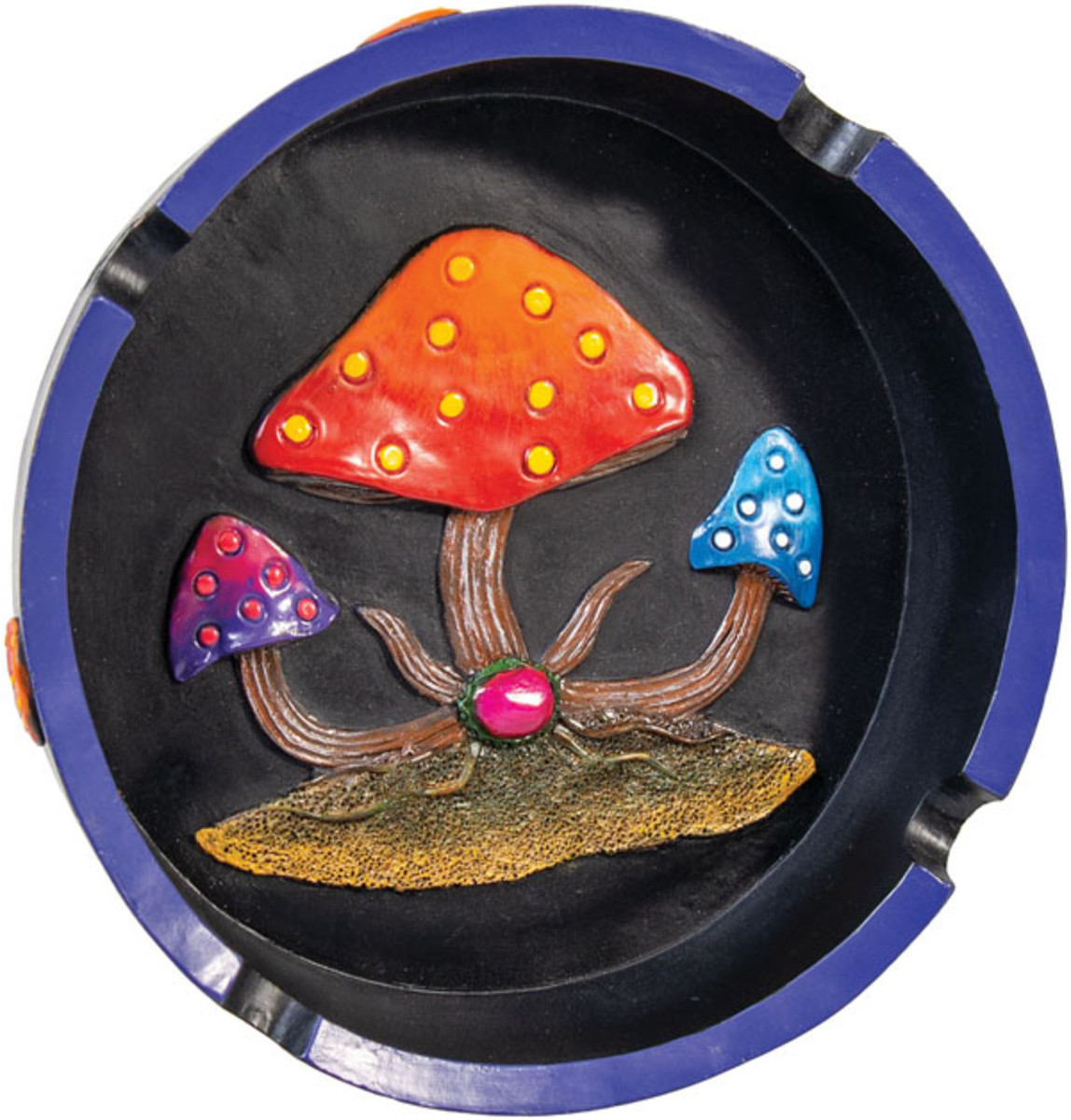 The Mushroom Ashtray is made with durable polyresin with a colorful triple shroom design on a black background. Diameter measures 5.75 inches.