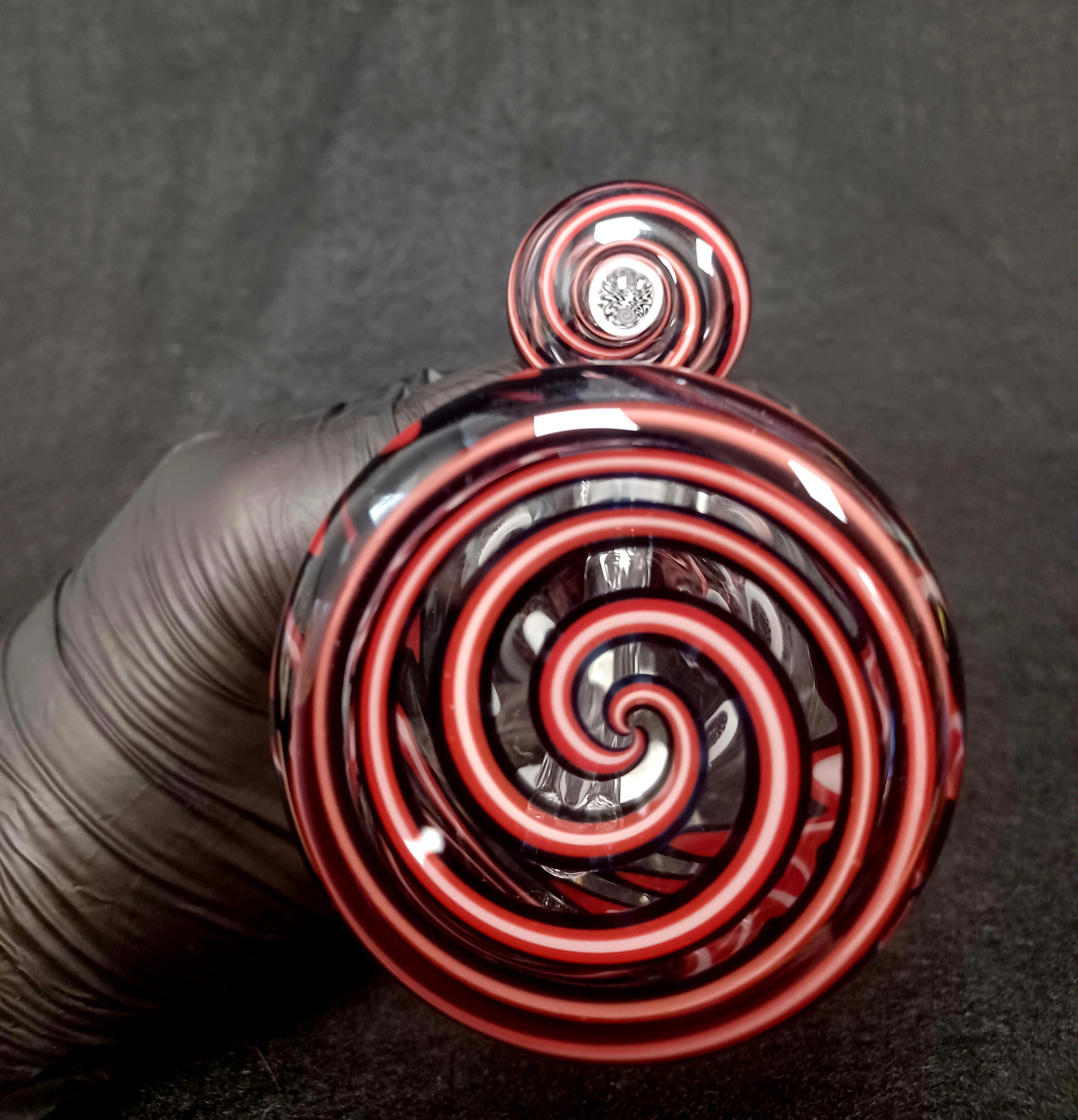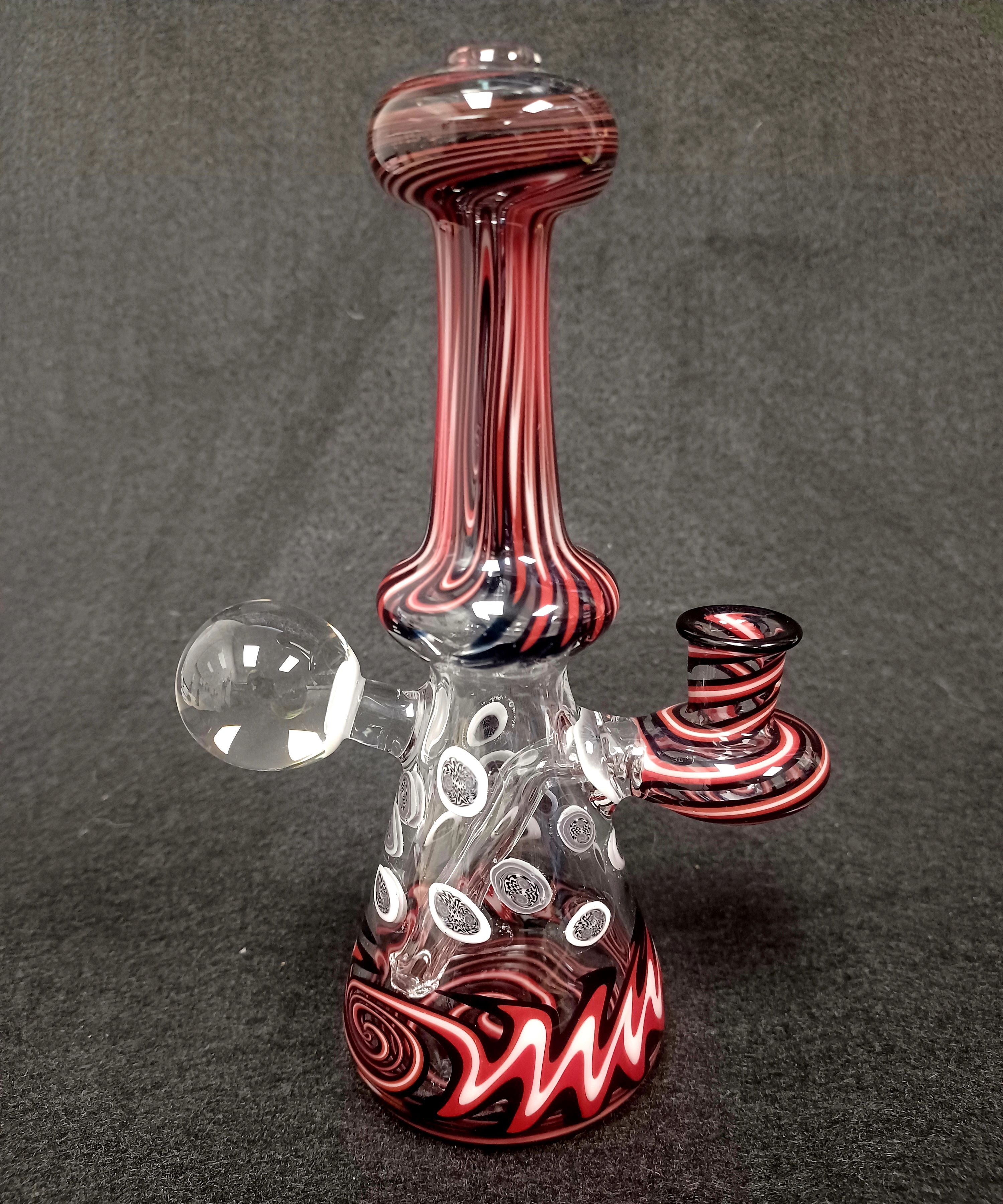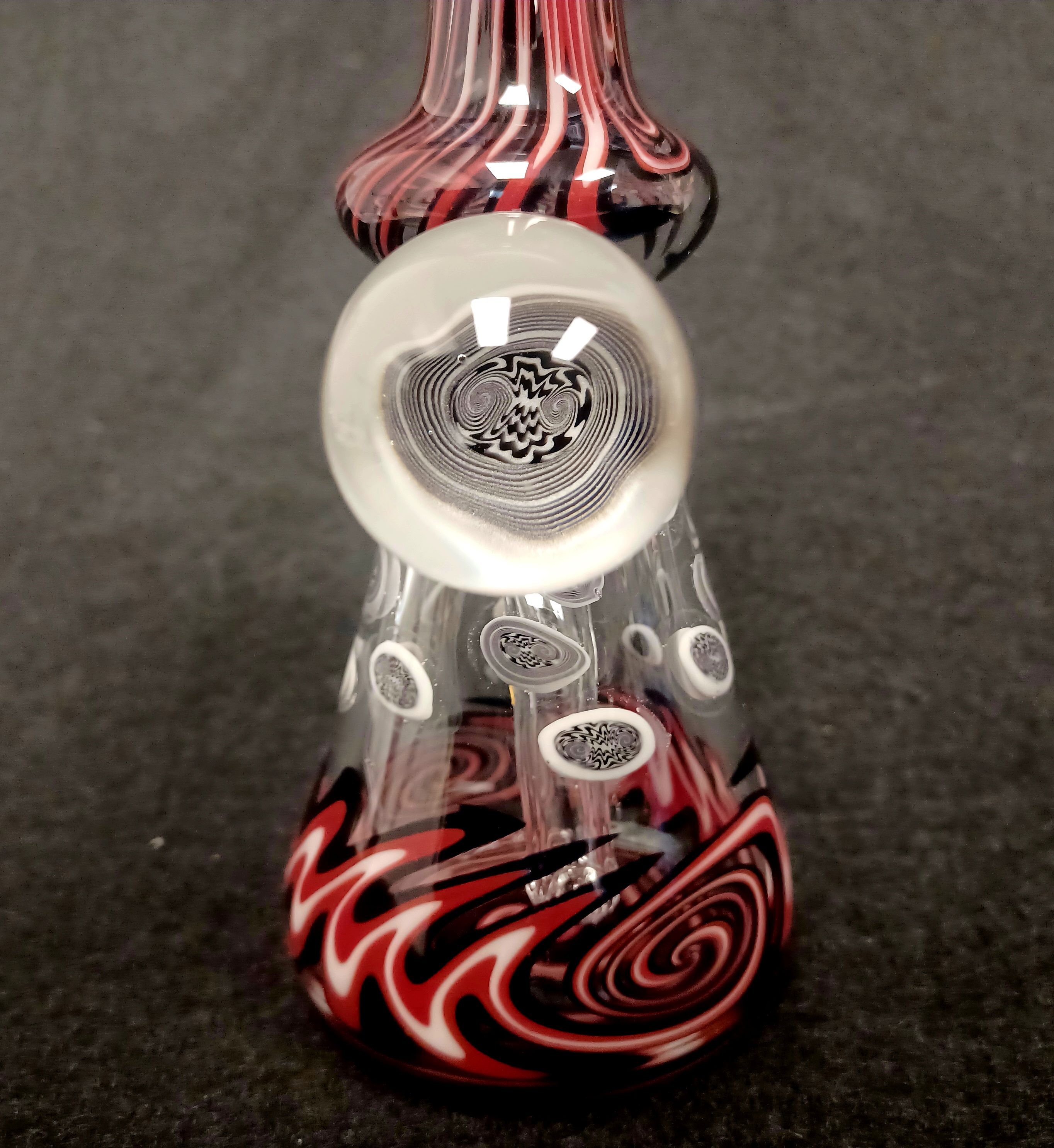 Check out this trippy rig from PST glass! Tons of millie chips are worked into this piece with red, black, and red wig wag! Size 10mm