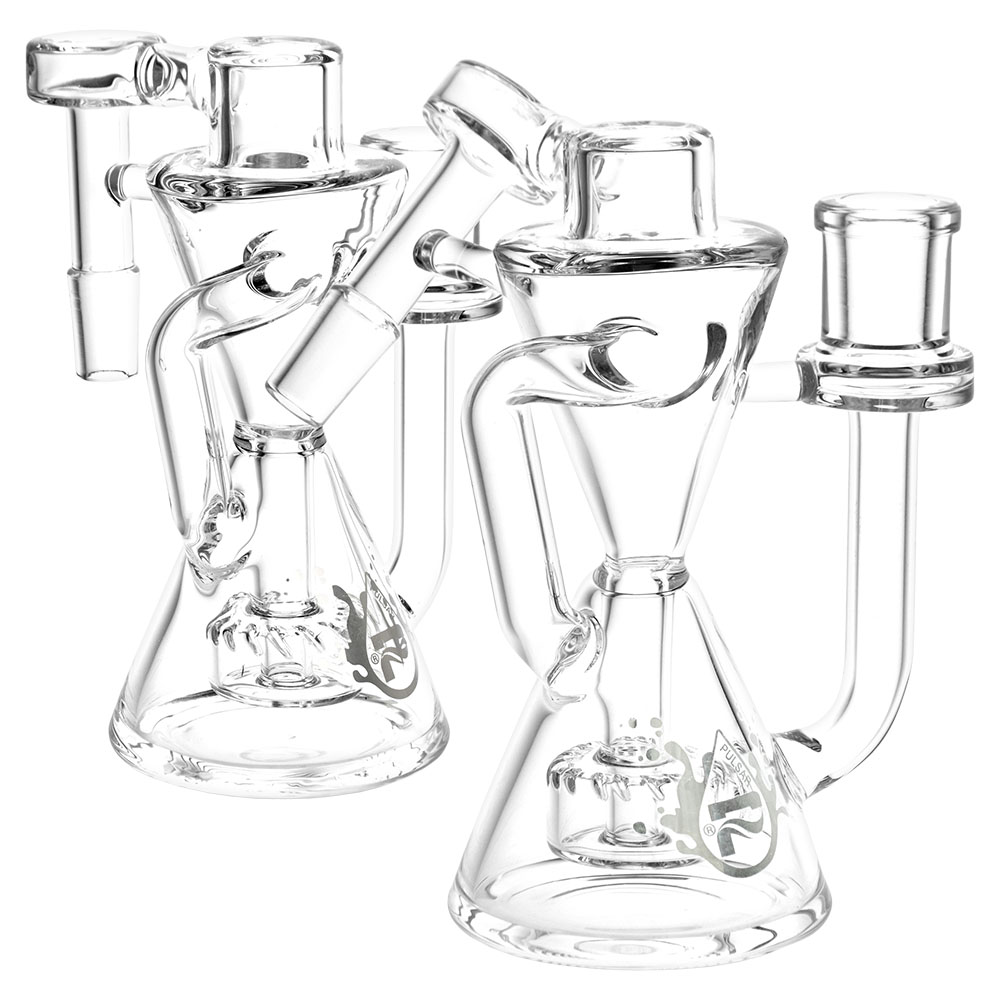 This Pulsar Hourglass Recycler Ash Catcher has an hourglass-shaped recycler build that cycles water and prevents resin build-up. This ash catcher features a disc style percolator which adds an extra level of filtration to any 14mm female water pipe or dab rig with a 45 degree or 90 degree joint angle.