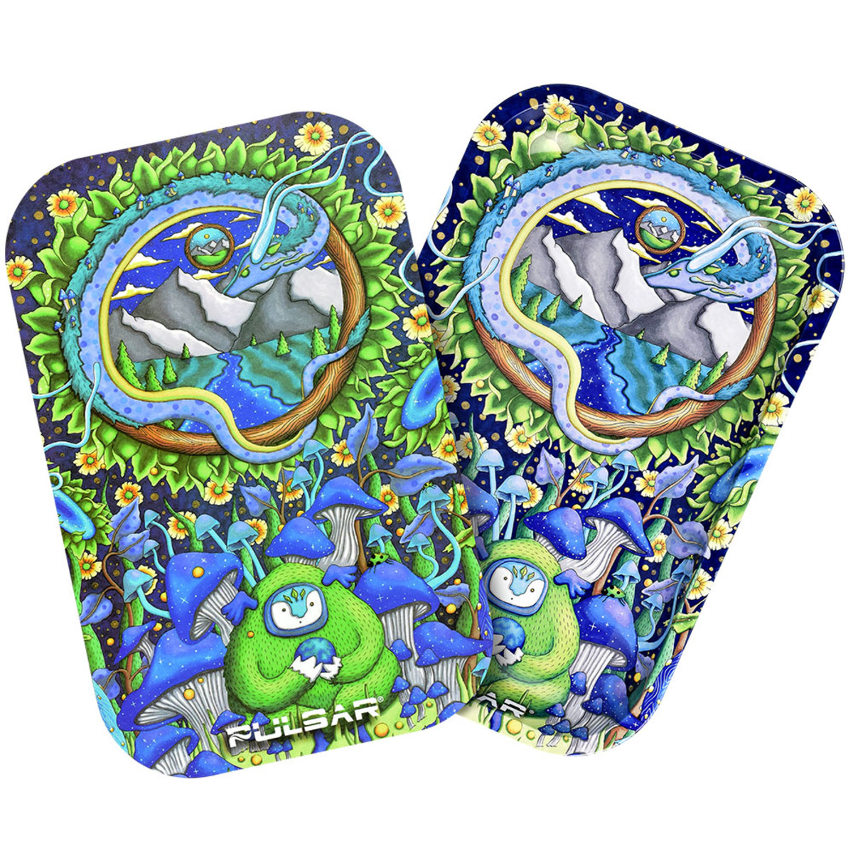These Pulsar Rolling Tray & Lid Combos are perfect for protecting herb and smoking gear from chaos and debris, and they feature the Remembering How To Listen design by featured artist Hannah Bunzey. These lightweight metal rolling trays have raised edges to contain all loose herb and assist with rolling. The matching lid fits securely on top of the tray and magnetically attaches to the edges to protect all contents. Both tray and lid measure 11 inches by 7 inches