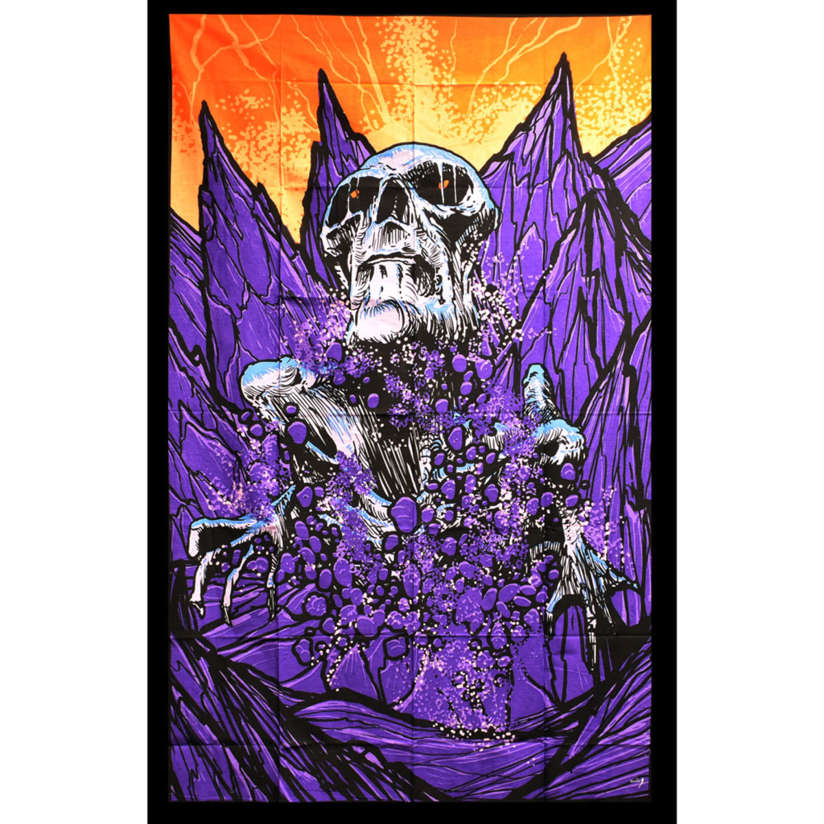 These brilliant tapestries are perfect for decorating dorm rooms, covering couches, or taking out on a picnic. Measures 55 inches by 83 inches. Features The Great Awakening design which hosts a possessed skeleton arising from the purple-hued earth. By artist David Paul Seymour.
