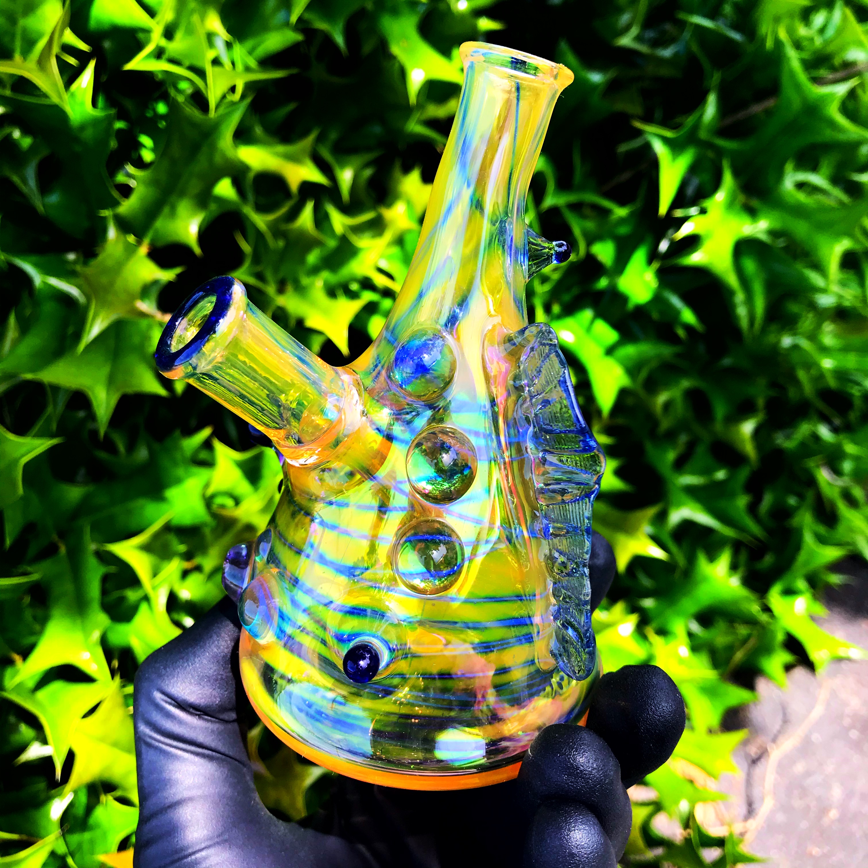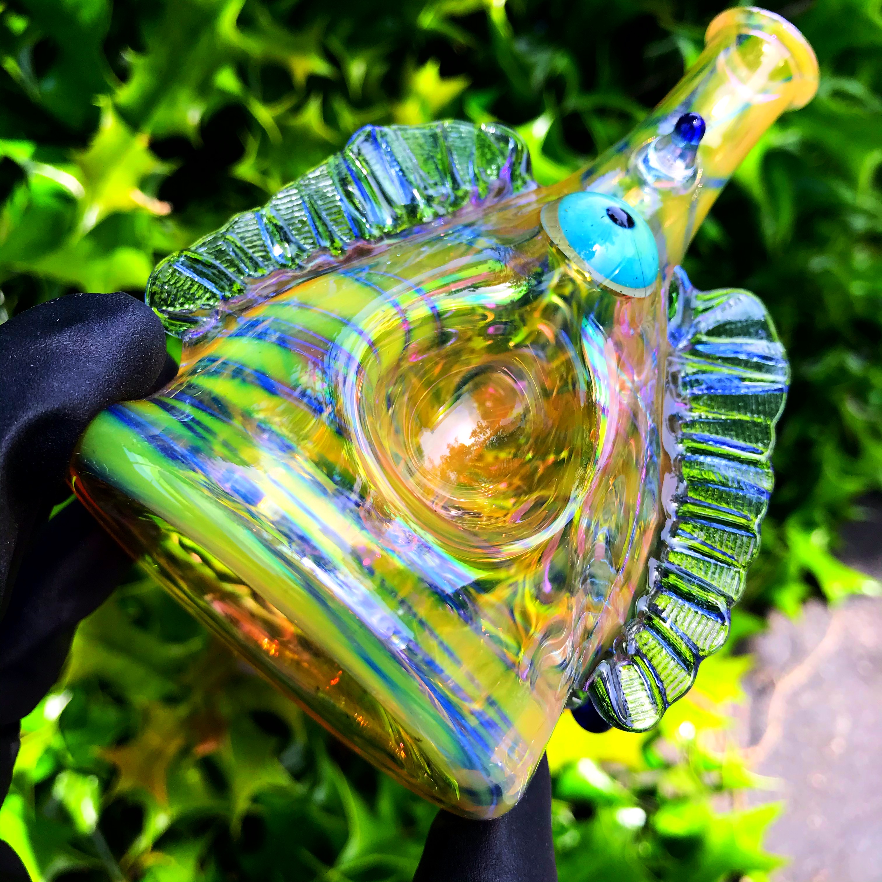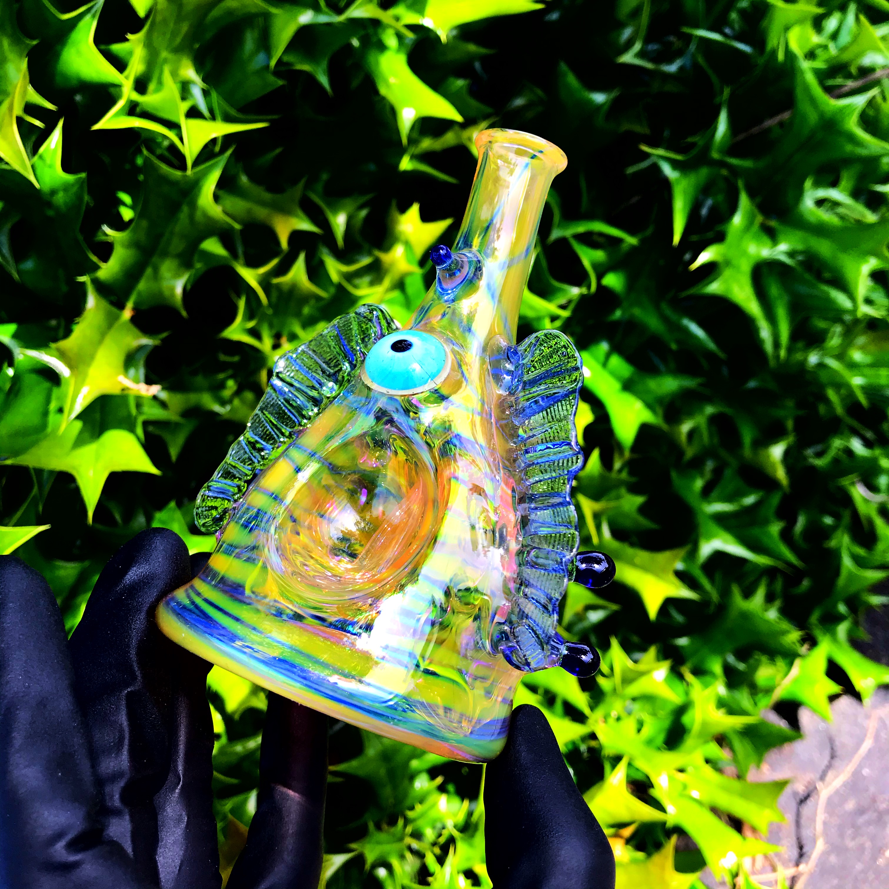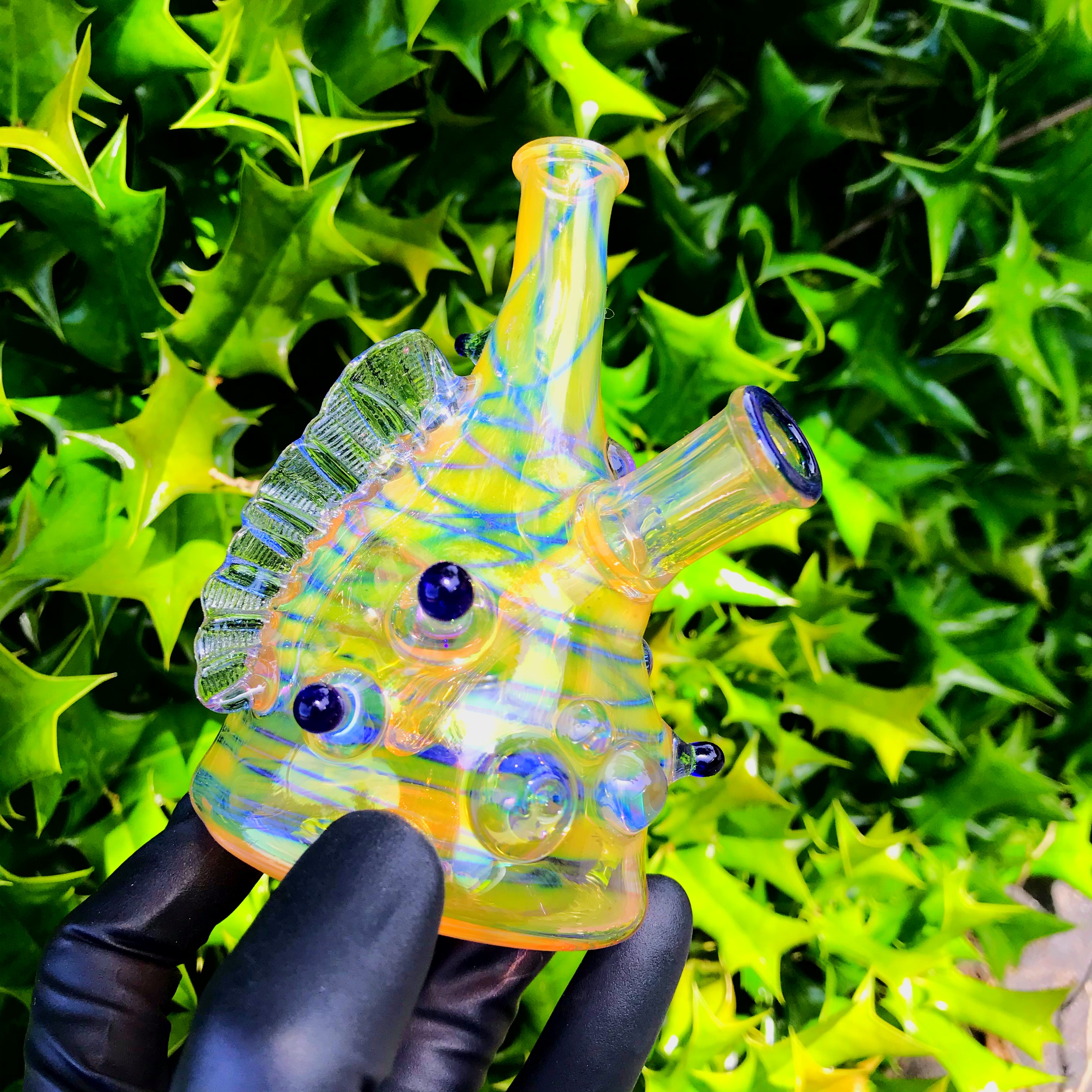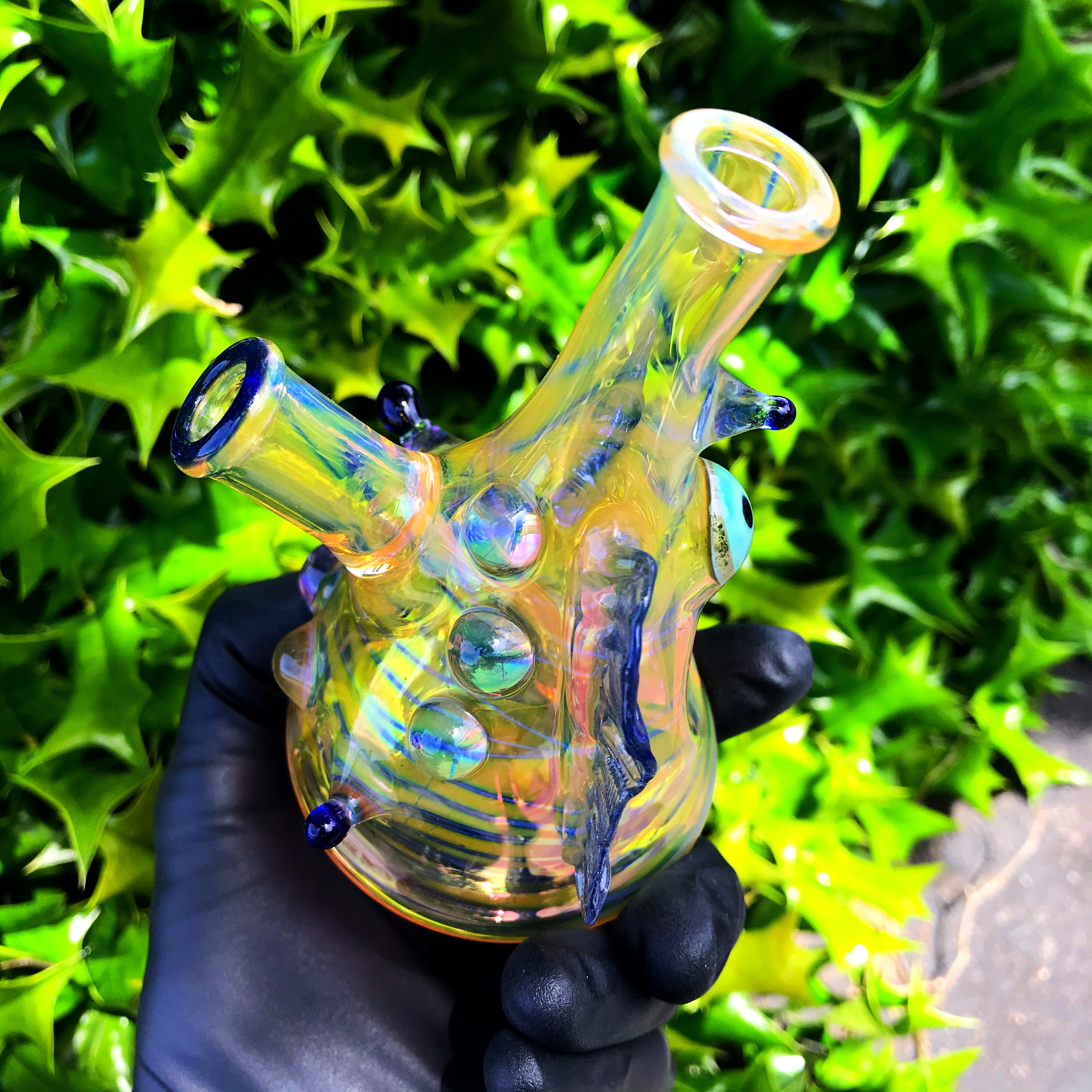 This creature made by RX Glassworks is full of fume work, a 10mm joint, and a three hole downstem for pristine function! The eyeball in the front is just a little extra something aesthetic pleasure!