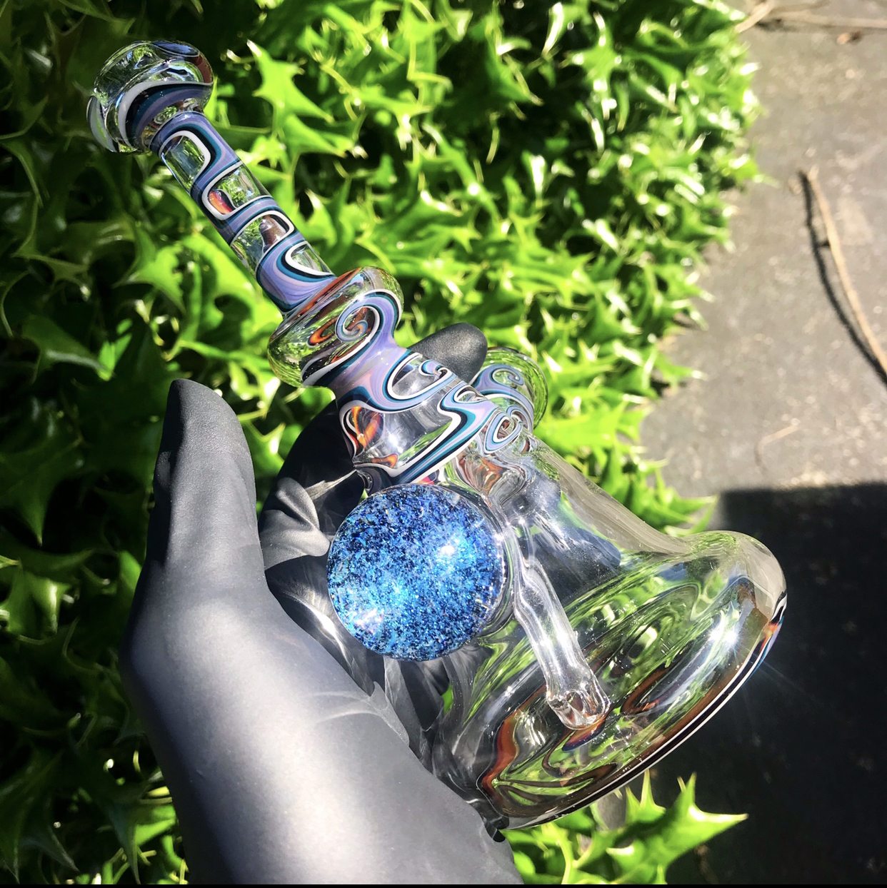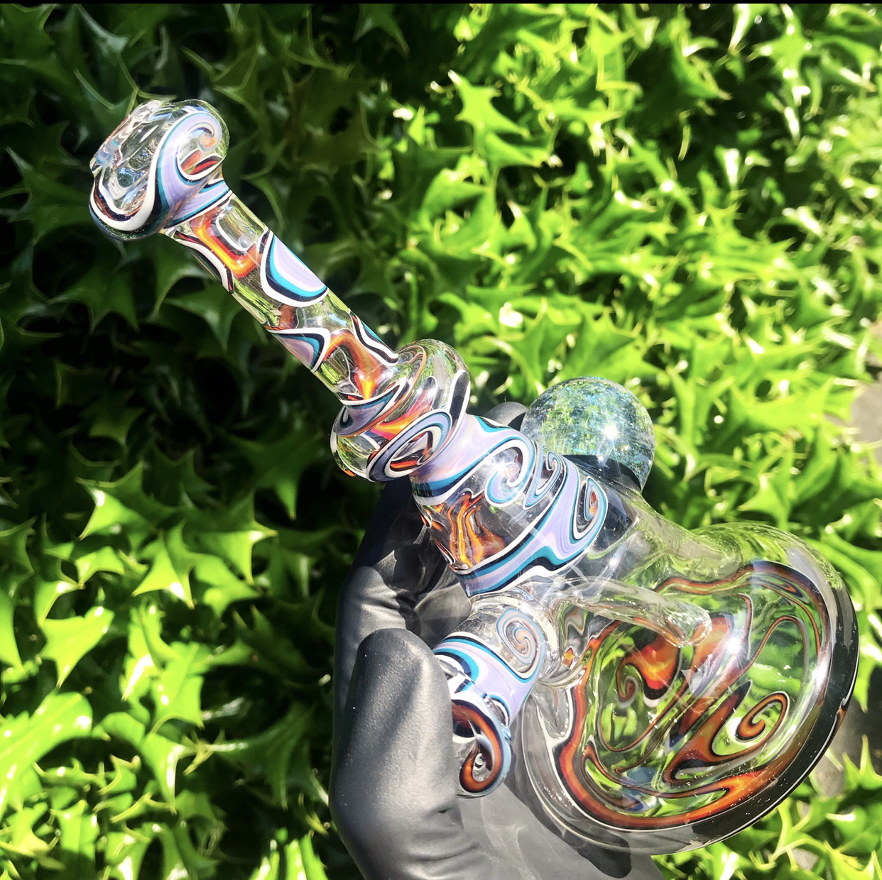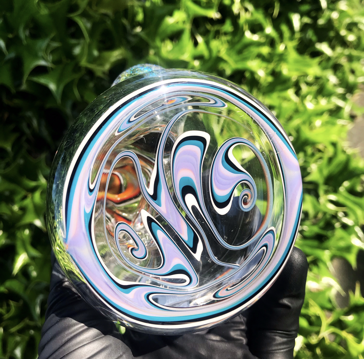 This Sherm Glass Fire and Ice reversal is absolutely perfectly shaped. Fire linework on the inside, with ice linework on the outside. Features a huge dichro marble on the back!