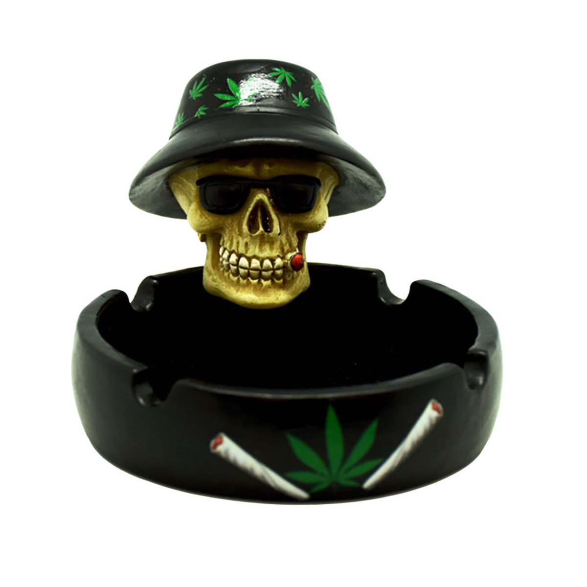 These polyresin ashtrays measure 4 inches wide and stand 3.25 inches tall. The “Stoned to the Bone” design features a bucket hat-wearing skull holding a roach in its teeth.