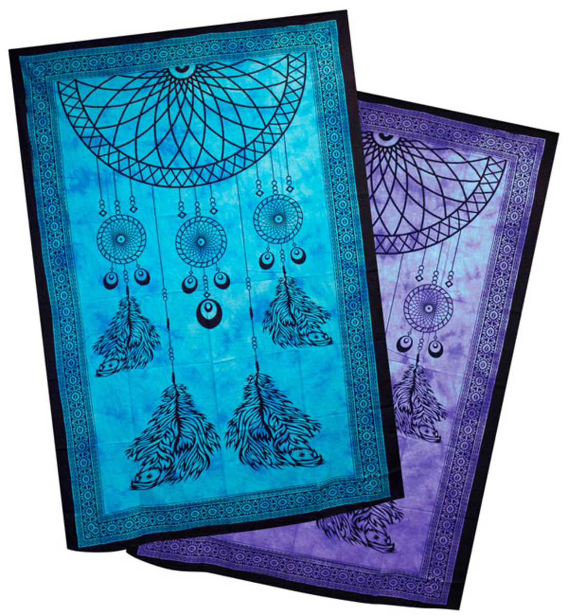 The ThreadHeads Geo Dreamcatcher Tapestry measures 55 inches by 83 inches and features a large dreamcatcher and feathers on brightly colored tie dye backgrounds. Made in India. 100% cotton. Colors vary.