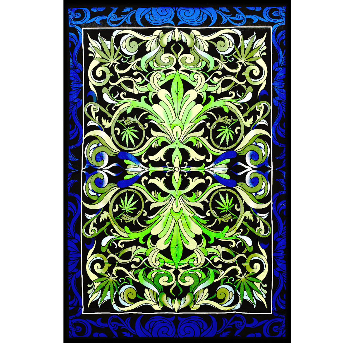 The ThreadHeads Hemp Leaf Kaleidoscope Tapestry measures 55 inches by 83 inches and features a symmetrically quartered, swirling hemp leaf design. This tapestry is made of 100% cotton and is made in Nepal.