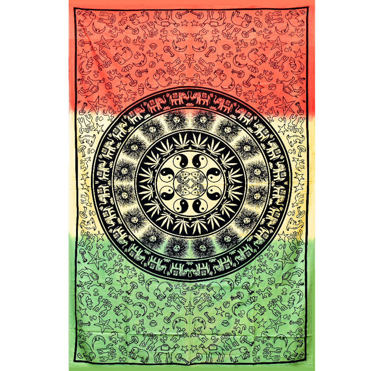 The ThreadHeads Multi-Pattern Rasta Mandala Tapestry measures 55 inches by 83 inches and features a mandala design on a patterned rasta-colored background. This tapestry is made of 100% cotton and is made in Nepal.