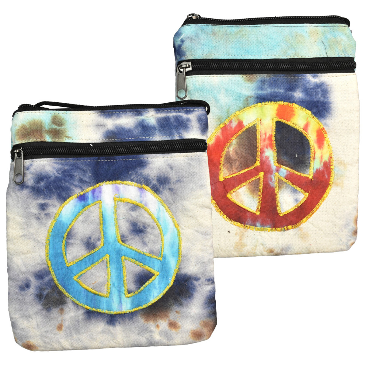 This ThreadHeads Tie-Dye Peace String Strap Bag measures 7″ x 8″ and features a tie dye design and embroidered peace sign made in Nepal. This attractive bag has an over the shoulder string strap and two zippered compartments.