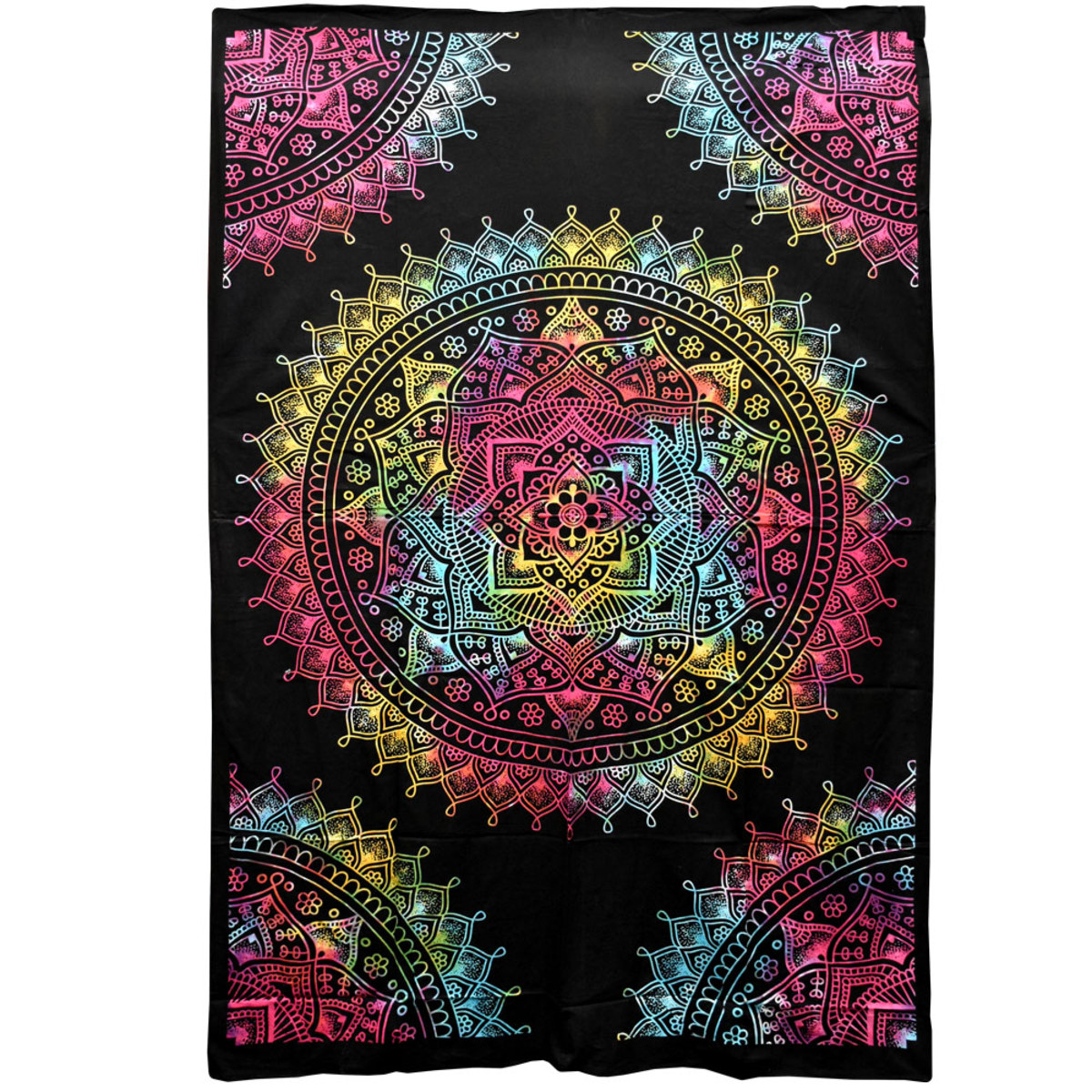 The Tribal Mandala Cotton Tapestry measures 55 inches by 85 inches and features a multicolored, beautifully symmetrical tribal mandala design. This tapestry is made of 100% cotton and is made in India.
